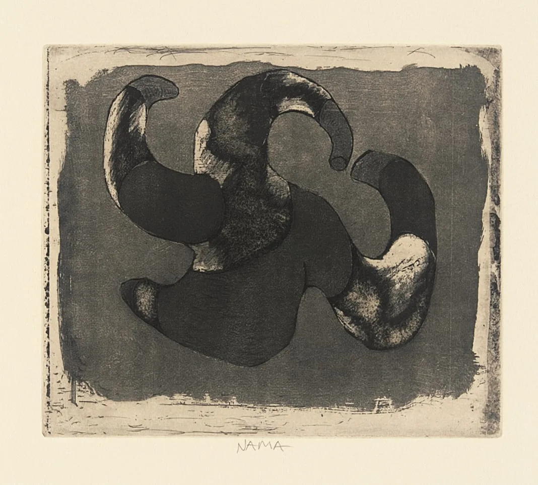 Intaglio print with an abstract, pinwheel-like organic form in deep charcoal and pale gray tones on a dark slate-gray ground, cream paper