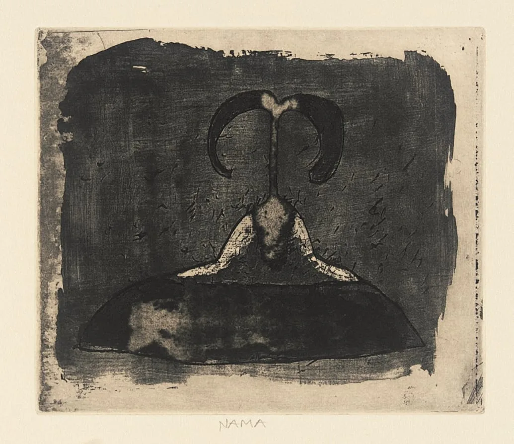 Intaglio print in black and gray on ivory paper, abstract symmetrical figure with upward-curving horns over a pale triangular form, with the word "NAMA" handwritten below