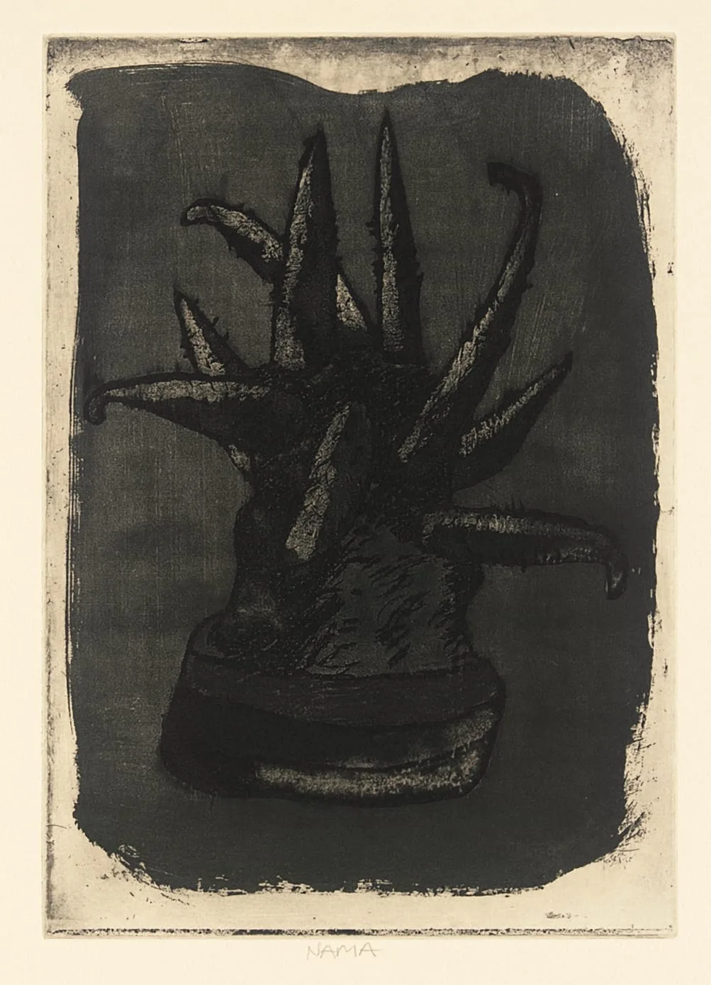 Dark intaglio print of a spiky potted succulent plant, nearly silhouetted in deep black ink against a dark background, on cream paper, with the word NAVIA below