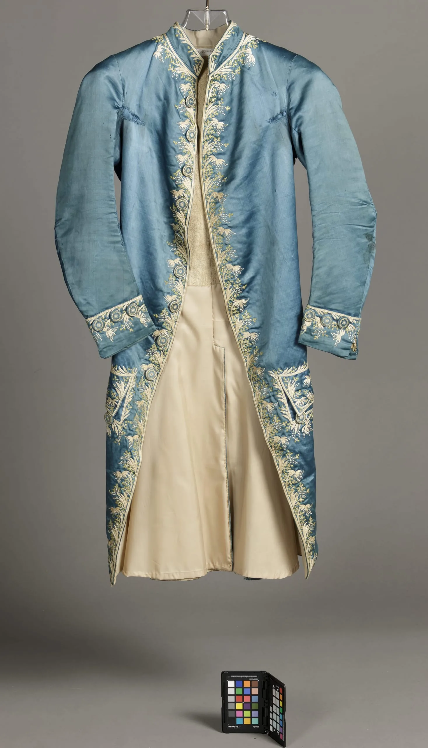 18th-century man's frock coat in sky-blue silk with dense ivory and green embroidered borders along the front edges, pocket flaps, and cuffs, displayed over a cream waistcoat
