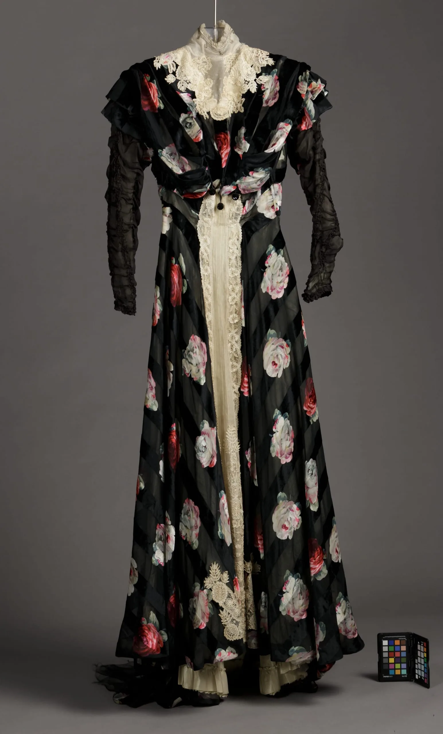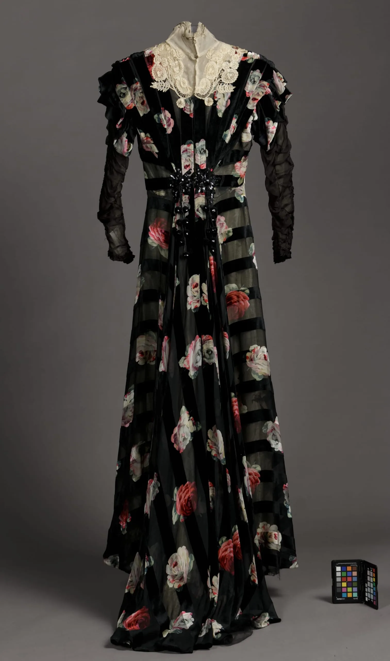 - Silk velvet, voided, and silk plain weave (chiffon), with linen lace, and sequin and glass bead tassels