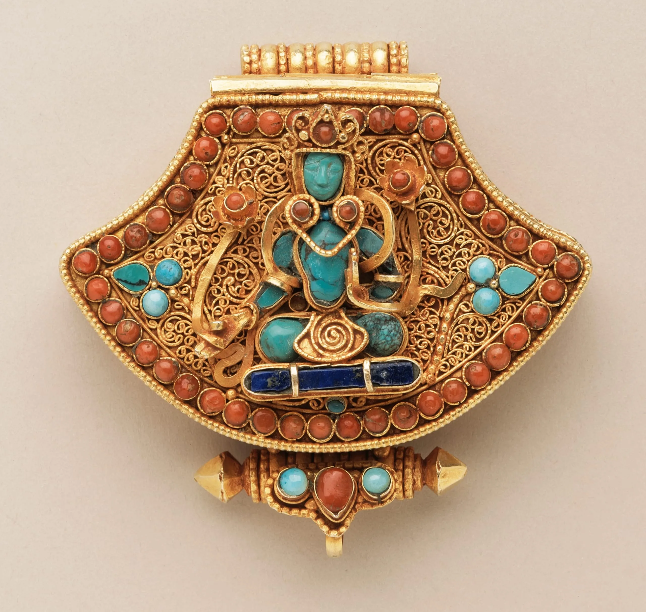 See numerous comparable amulet pendants in Jane Casey Singer, Gold Jewelry from Tibet and Nepal (New York: Thames and Hudson, 1996); and John Clarke, Jewellery of Tibet and Himalayas (London: V&A Publications, 2004).