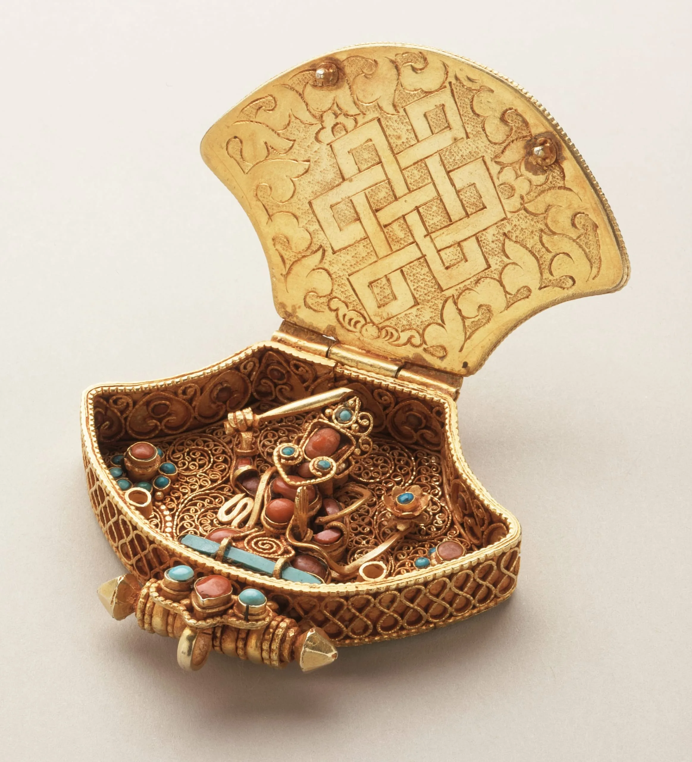 Here, rather than containing an inscribed sacrament, two revered Buddhist deities are embodied in gemstones. On the cover Green (Shyama) Tara is represented in turquoise with gilt silver and red coral jewelry and lotus attributes. She sits on a throne made of lapis lazuli. She is centered against a flowering tree made of gilt silver filigree and turquoise blossoms. The border is made of red coral and bead molding. In the interior Manjushri is depicted in red coral with gilt silver and turquoise jewelry. His throne is made of turquoise. He is placed against a similar flowering tree. Repeated designs in gilt silver wire scrollwork enrich the exterior and interior edges. The inside of the cover is adorned with an incised Endless Knot, symbolic of the Buddha’s infinite wisdom and compassion, and a vegetal border. The bottom is embellished with a repoussé crossed vajra (vishvavajra). The pendant is suspended by a bead and reel tube.