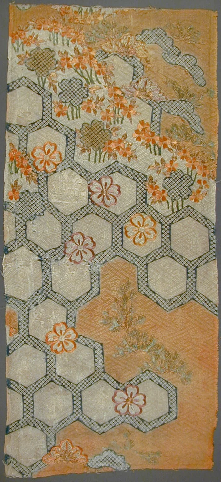 - Kosode (Kimono) Fragment with Pine Branches, Cherry Blossoms, and Geometric Abstracted Tortoise Shell Pattern
