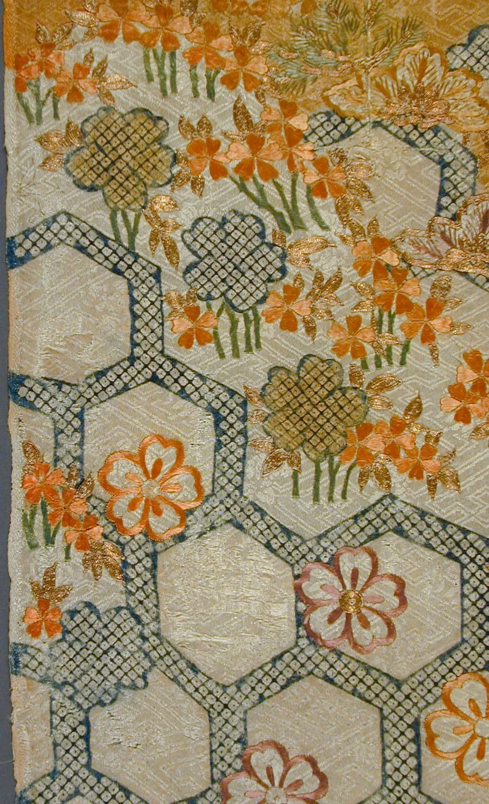- Silk figured satin (rinzu), stenciled imitation tie-dyed (kata kanoko shibori), silk-and gilt-paper-wrapped silk embroidery
