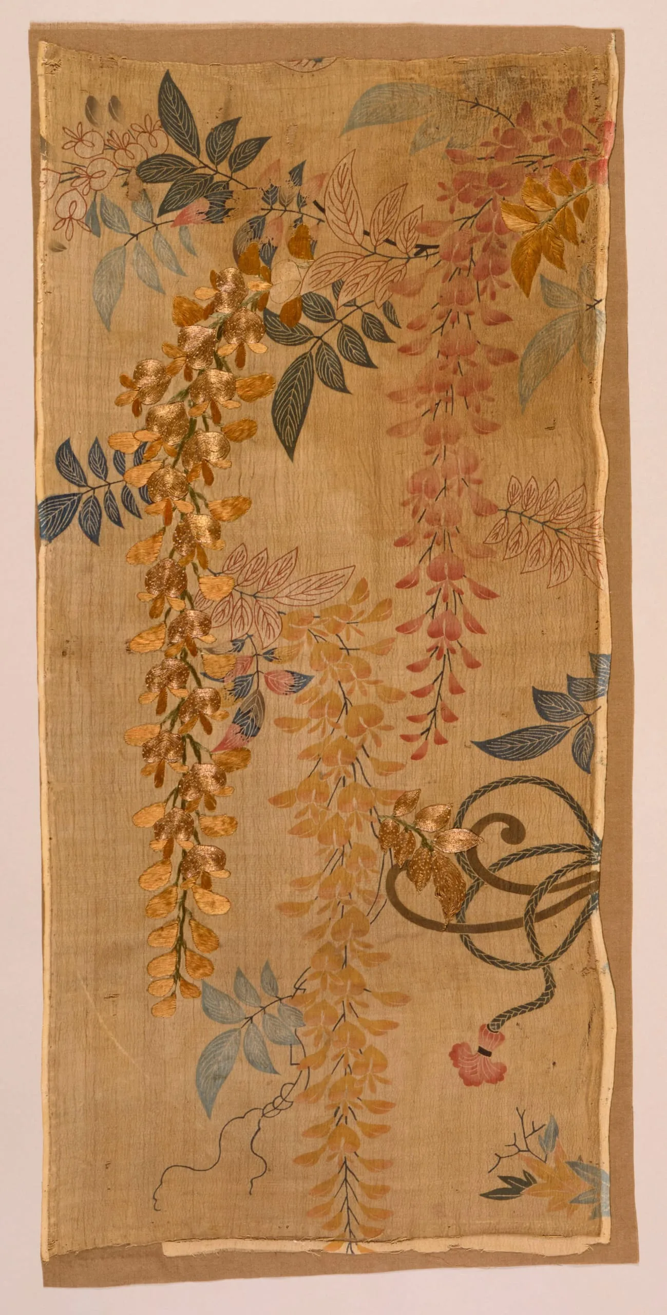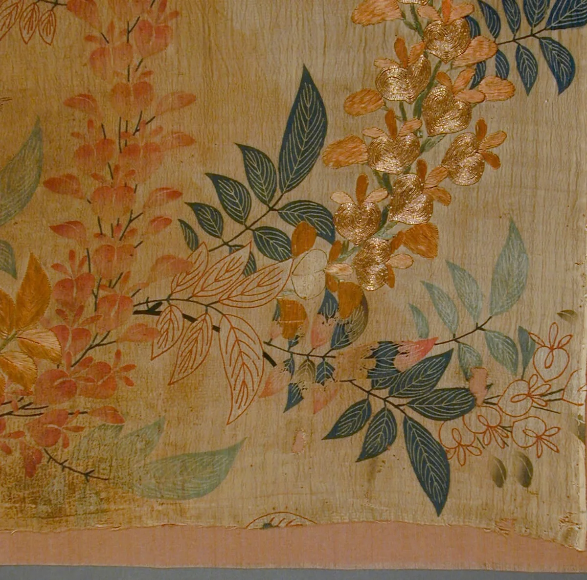 - Silk plain weave (crepe; chirimen), paste-resist dyed (yūzen) and silk and gilt-paper-wrapped silk embroidery