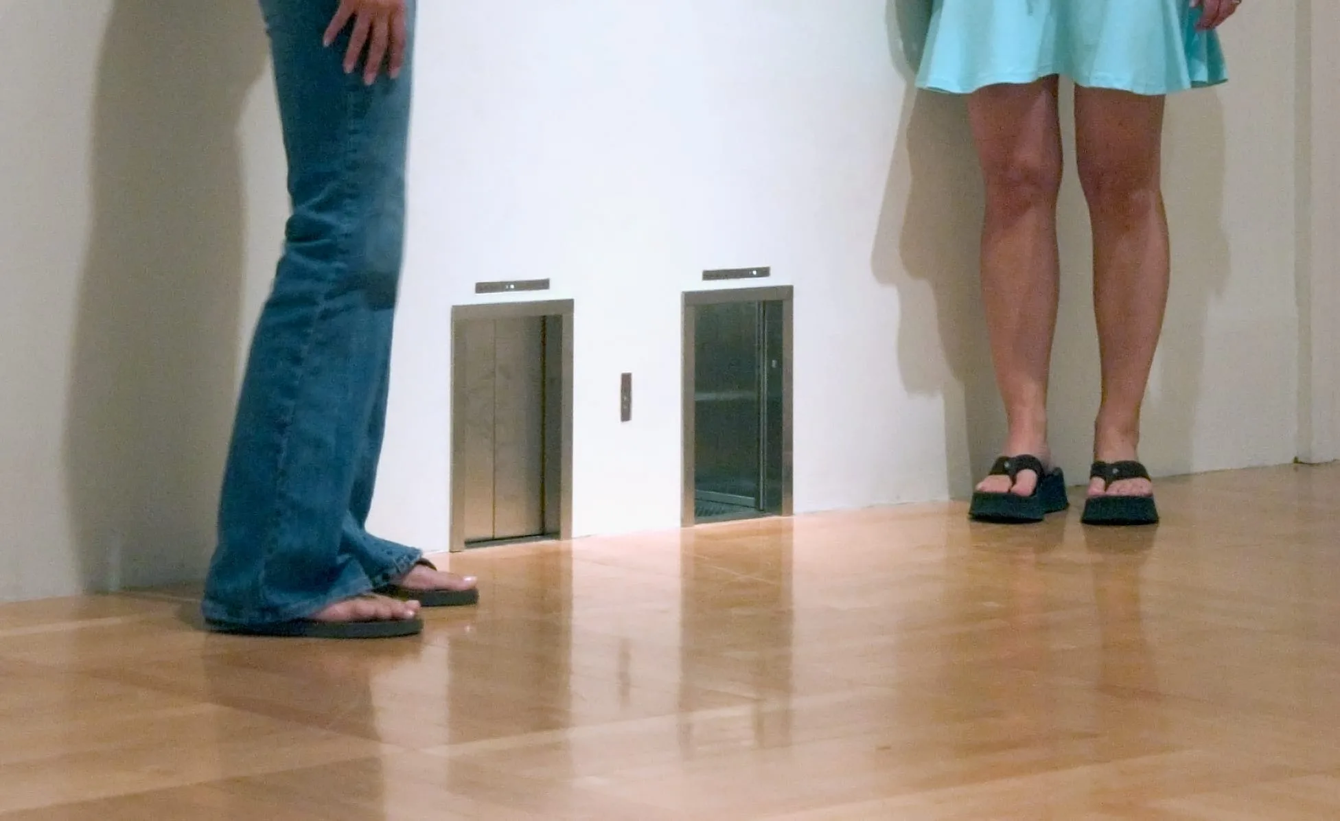 Maurizio Cattelan (born 1960) is often referred to as a prankster or provocateur because of the disorienting nature of his works. In 1992 visitors to a gallery opening found the space empty and the artist gone; Cattelan had fled from the second story via a rope of knotted bedsheets. For his Projects show at the Museum of Modern Art in New York in 1998, visitors entering the museum were greeted by an actor hired to wear an enormous papier-mâché Picasso head and his trademark striped shirt. One untitled work of Cattelan's from 2001 is a miniature replica of a commercial elevator that can be called by pressing tiny buttons. Every detail is carefully reproduced, from the steel handrails and fluorescent lighting inside the elevator to the lit numbers indicating movement from floor to floor; uncannily, the work suggests the monotony of a corporate environment. However, this tiny replica only appears to move. The absurdity of a minuscule elevator that goes nowhere is simultaneously whimsical and disquieting. It conjures up the world of Lewis Carroll's Through the Looking Glass and leaves us wondering if we are huge or the elevator is tiny.