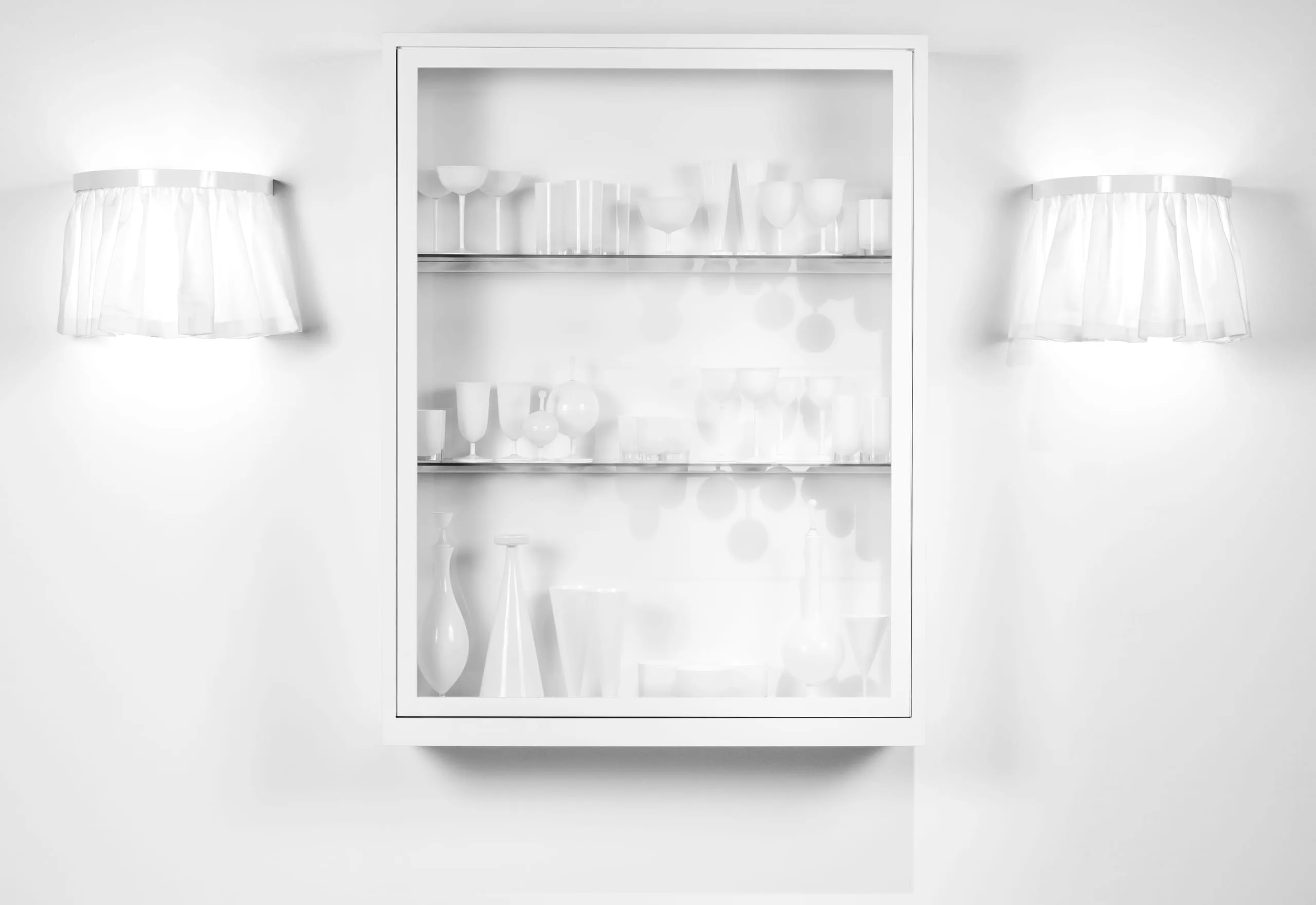 - a) Cabinet: 51 x 39 x 10 in. (129.54 x 99.06 x 25.4 cm); b-c) Wall sconce with curtain: 12 x 14 3/8 x 10 in. (30.48 x 36.51 x 25.4 cm) each; d-e) Glass shelf: 8 x 37 in. (20.32 x 93.98 cm) each; f) Cabinet frame: 48 1/2 x 37 x 7/8 in. (123.19 x 93.98 x 2.22 cm); Installation: 51 x 84 x 12 in. (129.54 x 213.36 x 30.48 cm)