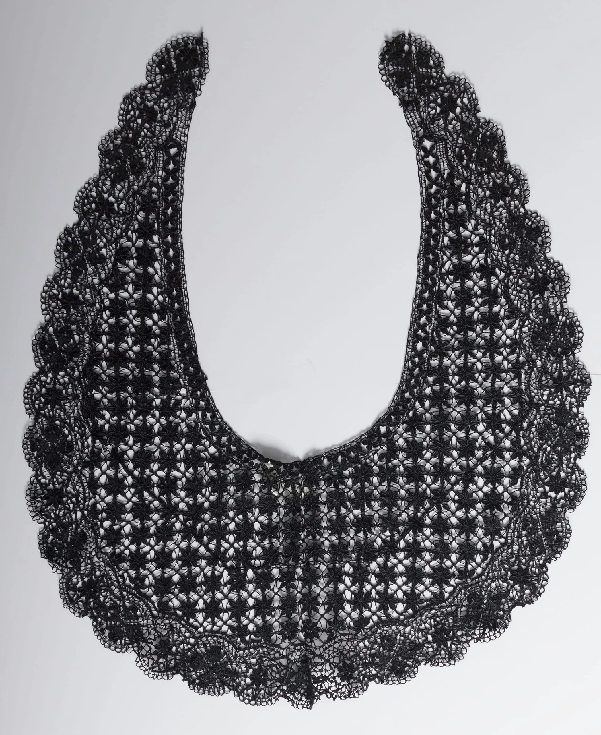 Black lace collar in a wide crescent shape with an allover repeating floral grid pattern and scalloped picot border along all edges