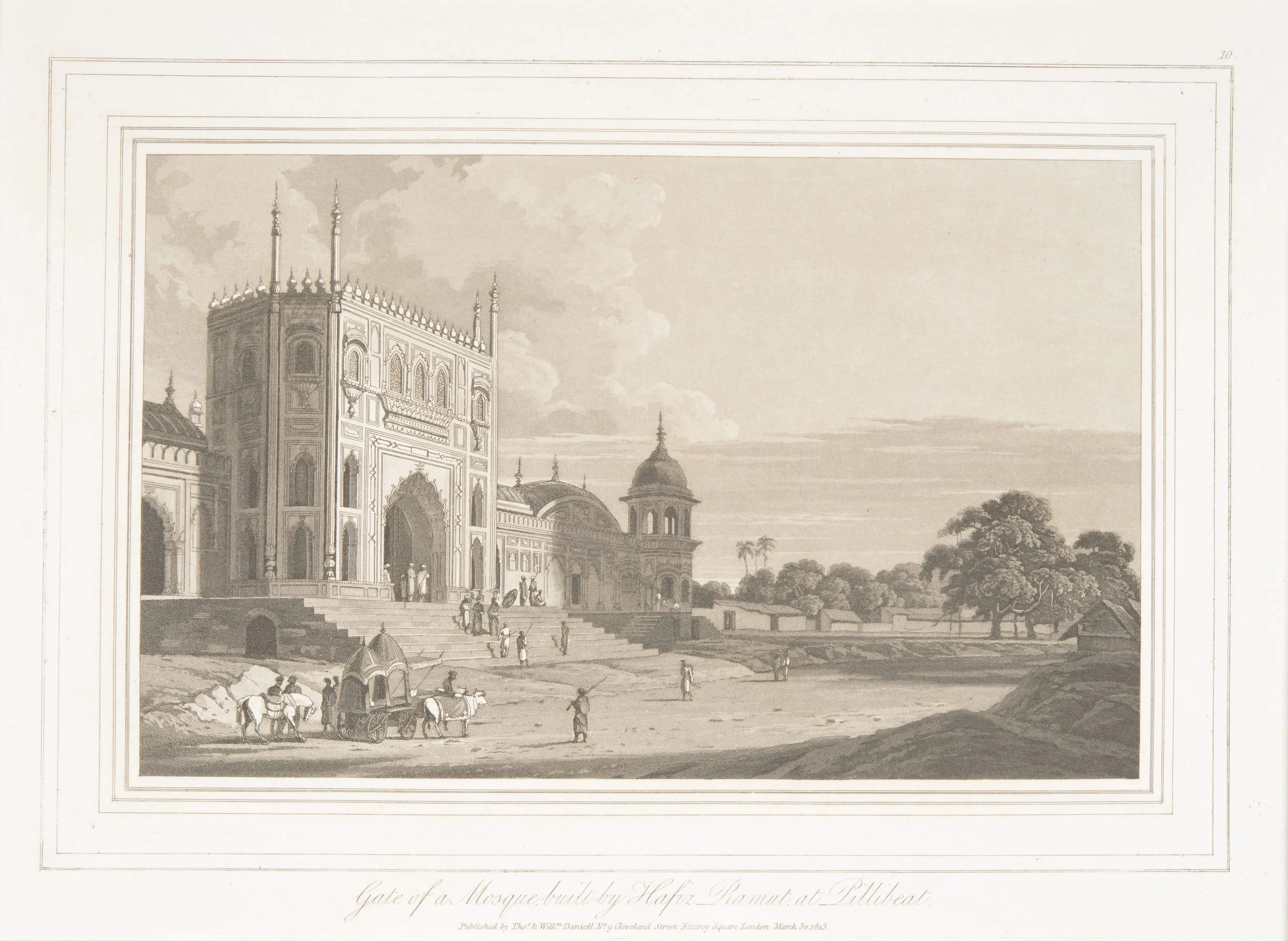 Thomas Daniell and his nephew William Daniell were the leading painters and engravers of Indian architecture and landscapes in the 18th-19th centuries. They were the first English artists to produce topographical views of India in their “Views in Calcutta” in 1788. Their best-known work is the monumental series “Oriental Scenery,” comprising 144 large hand-colored aquatint engravings in six volumes, which was published in London over between 1795-1808. William Daniell published a second edition of “Oriental Scenery” in 1812-1816, called the Quarto Edition, which featured smaller uncolored aquatint engravings, including this example.