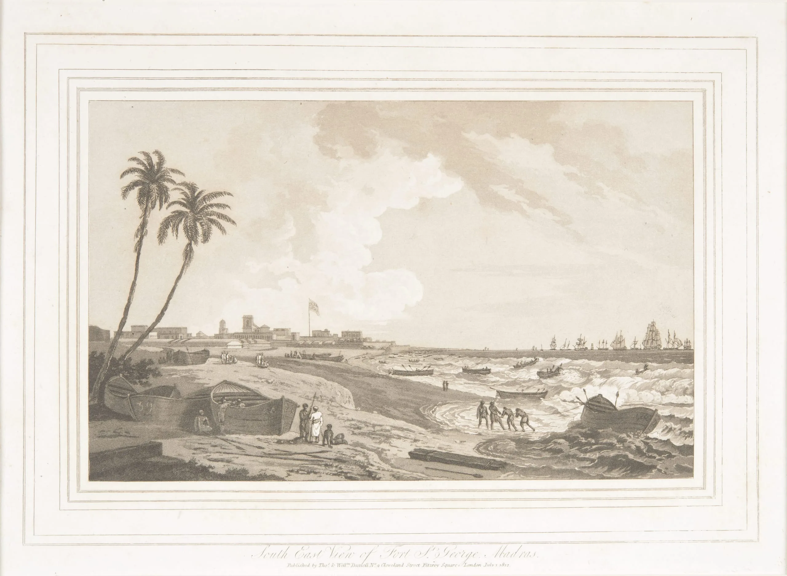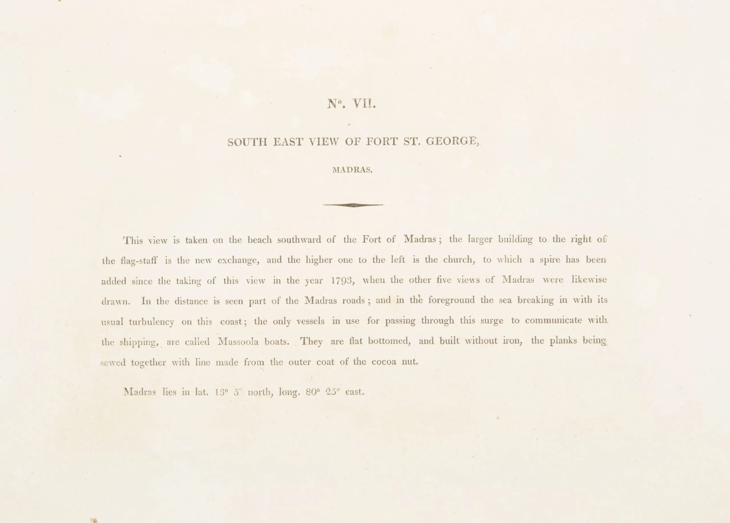 This view is taken on the beach southward of the Fort of Madras; the larger building to the right of the flag-staff is the new exchange, and the higher one to the left is the church, to which a spire has been added since the taking of this view in the year 1793, when the other five views of Madras were likewise drawn. In the distance is seen part of the Madras roads; and in the foreground the sea breaking in with its usual turbulency on this coast; the only vessels in use for passing through the surge to communicate with the shipping, are called Massoola boats. They are flat bottomed, and built without iron, the planks being sewn together with line made from the outer coat of the cocoa nut.