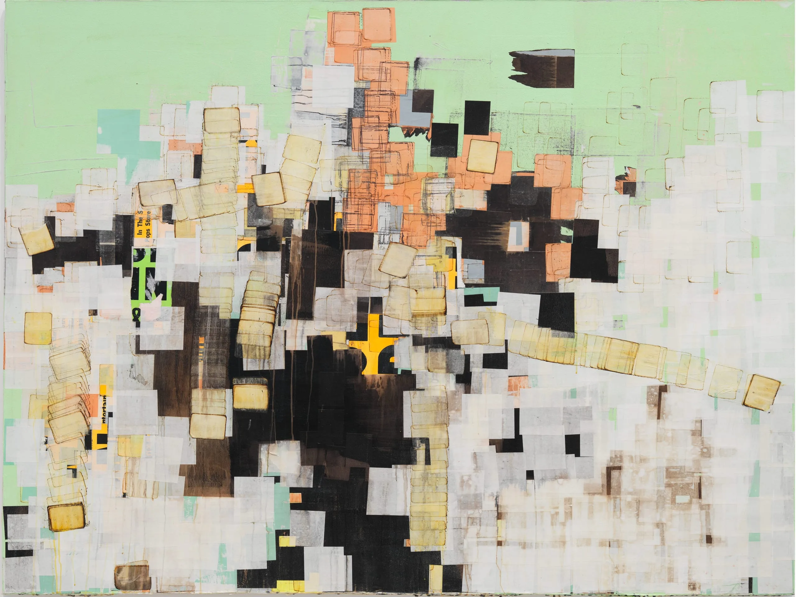 - Permanent wave end papers, electrophotographic print paper and acrylic paint on canvas