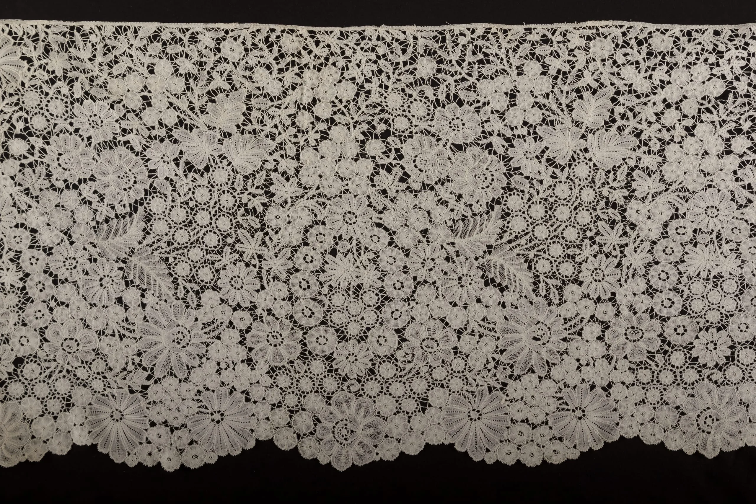 Horizontal strip of ivory-white bobbin lace with allover floral pattern, large circular blooms forming a scalloped lower edge, against a black background