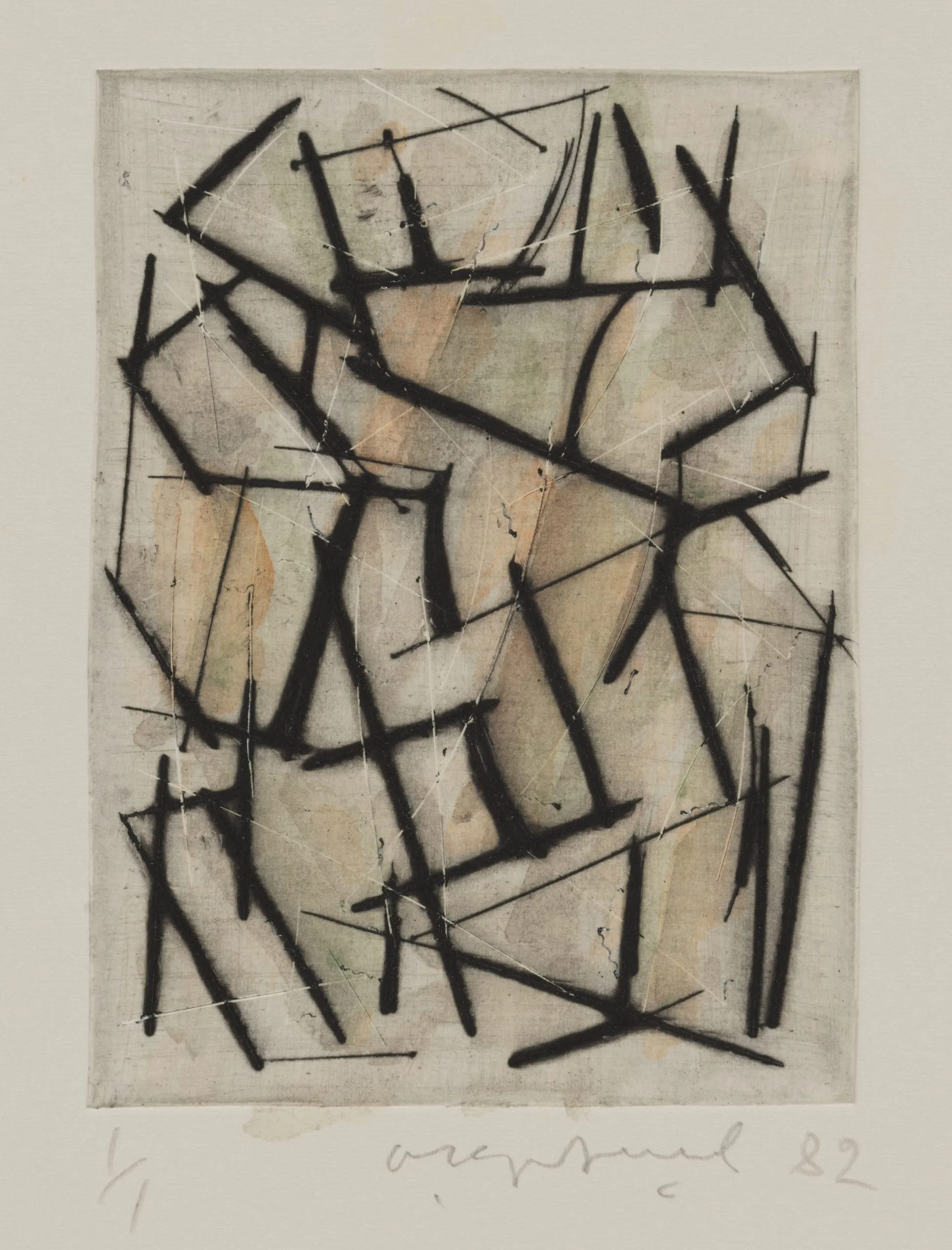 Abstract print with dense network of bold black diagonal lines over a pale gray and peach ground, with a graphite signature and date below