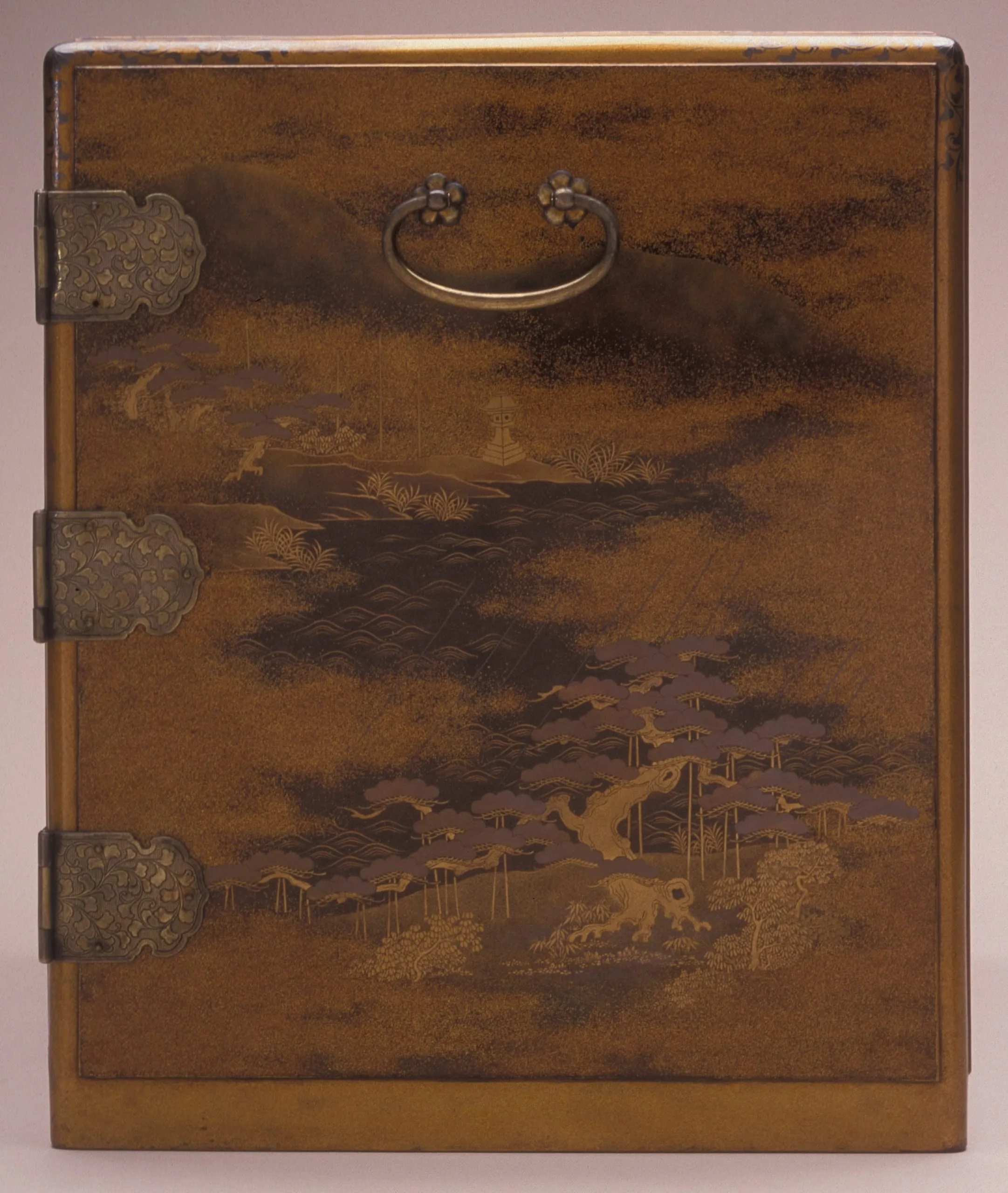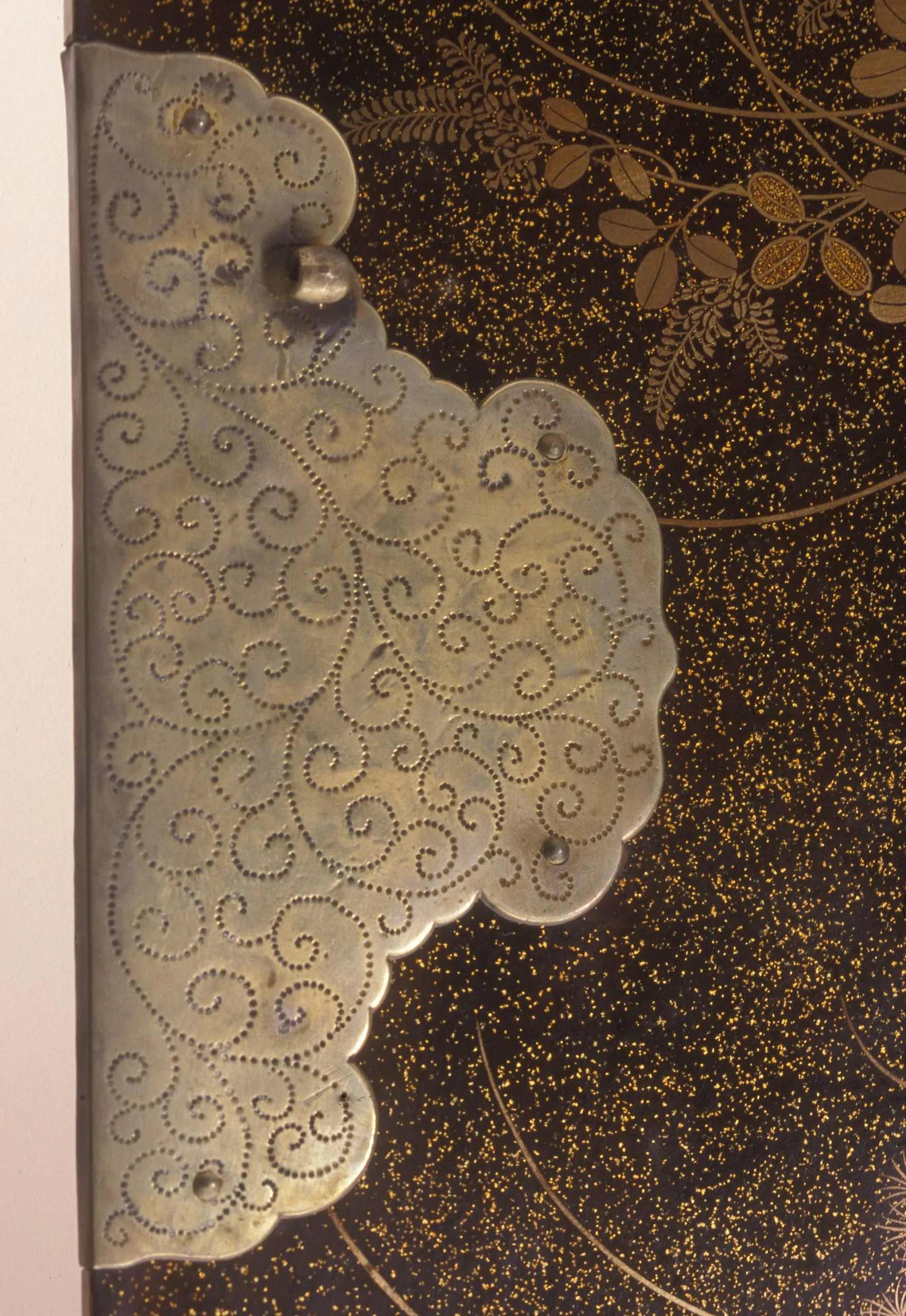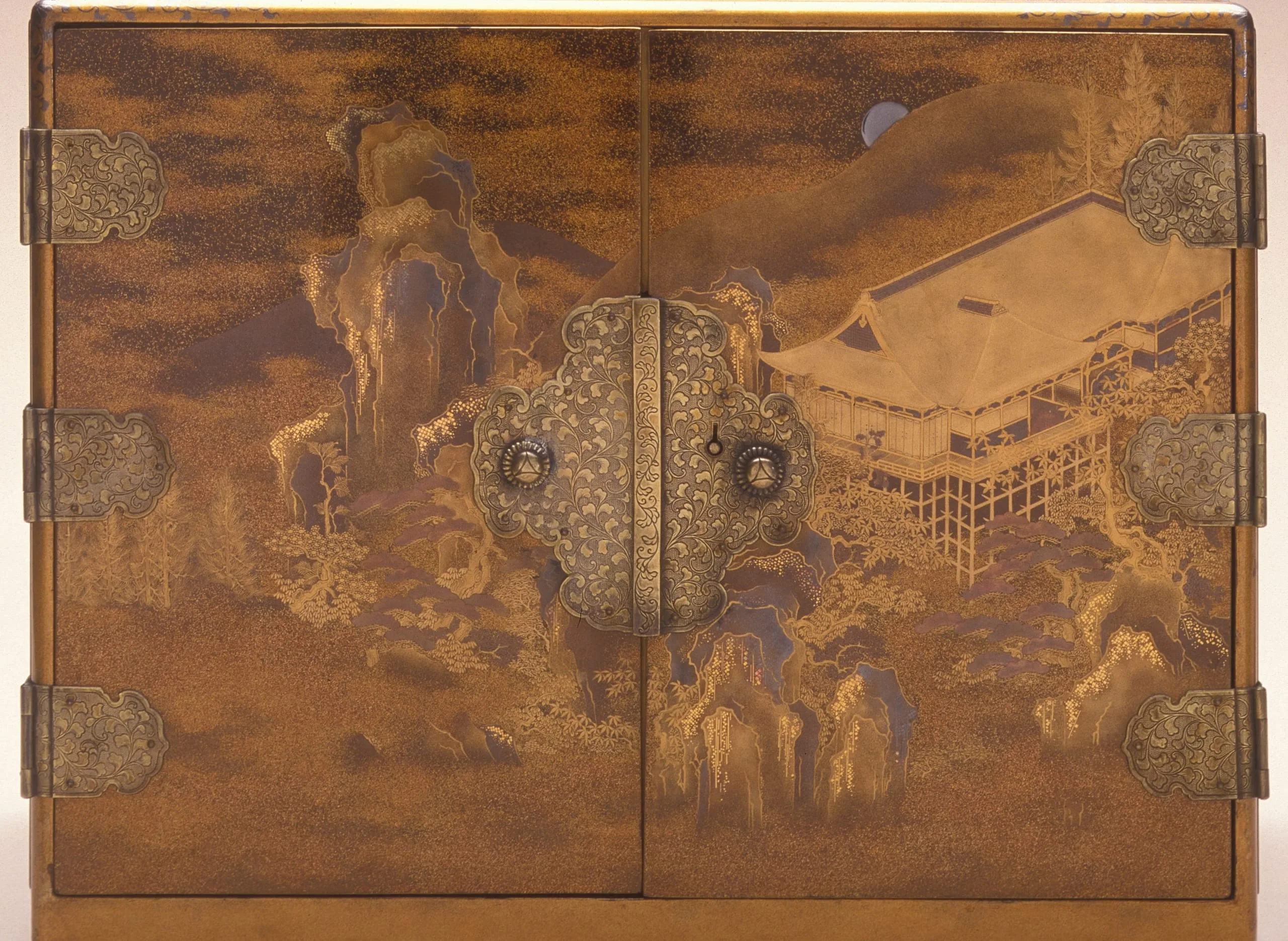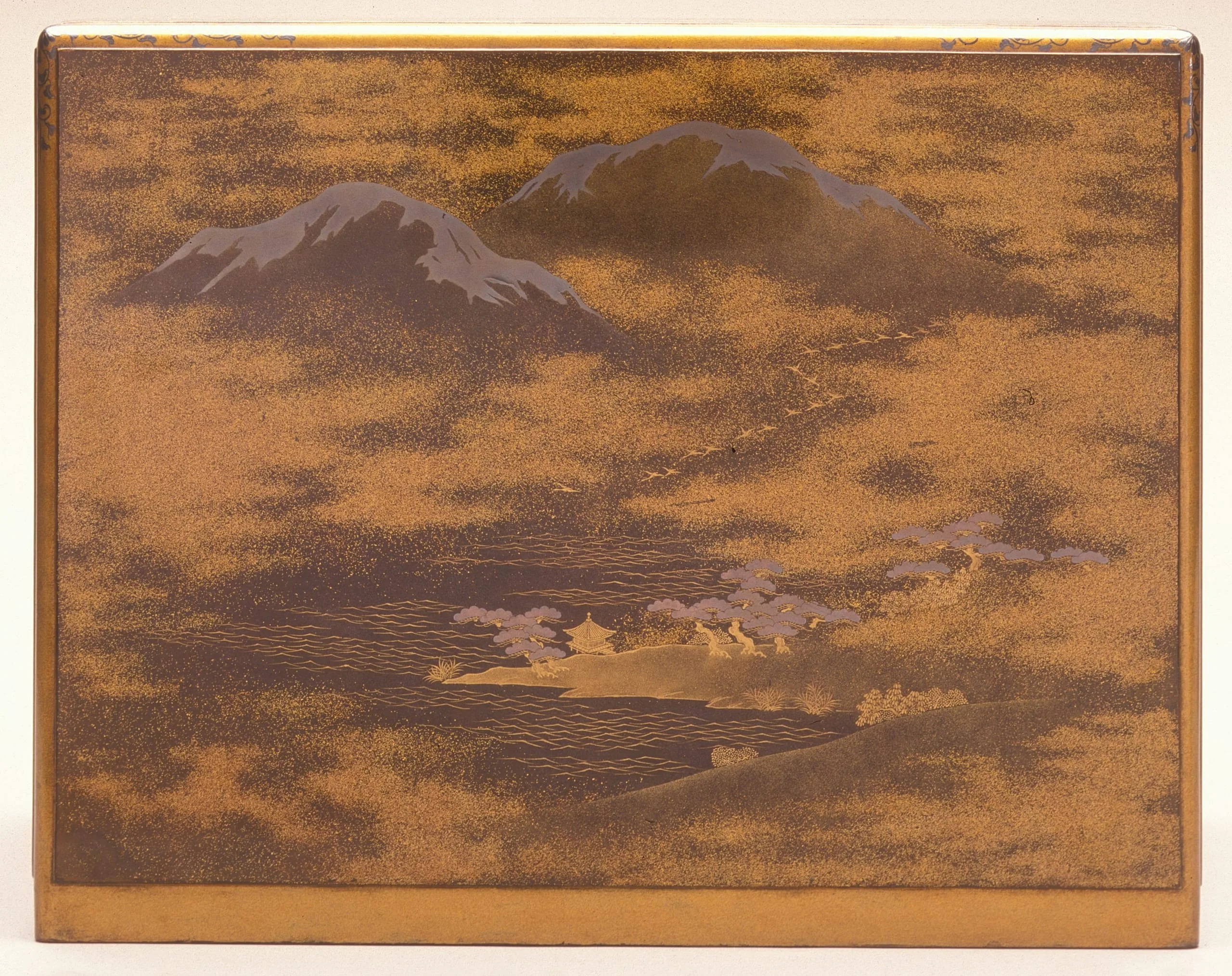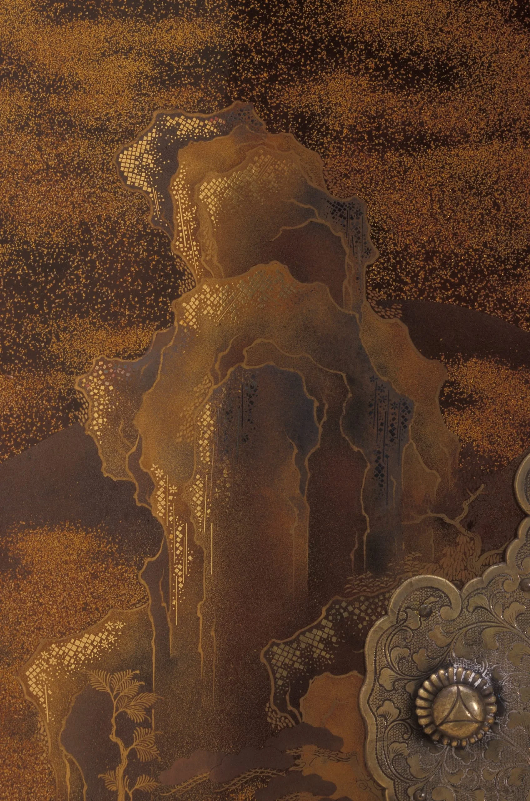 - Lacquer over wood; gold and silver leaf, flakes, and powder (makie); silver mounts