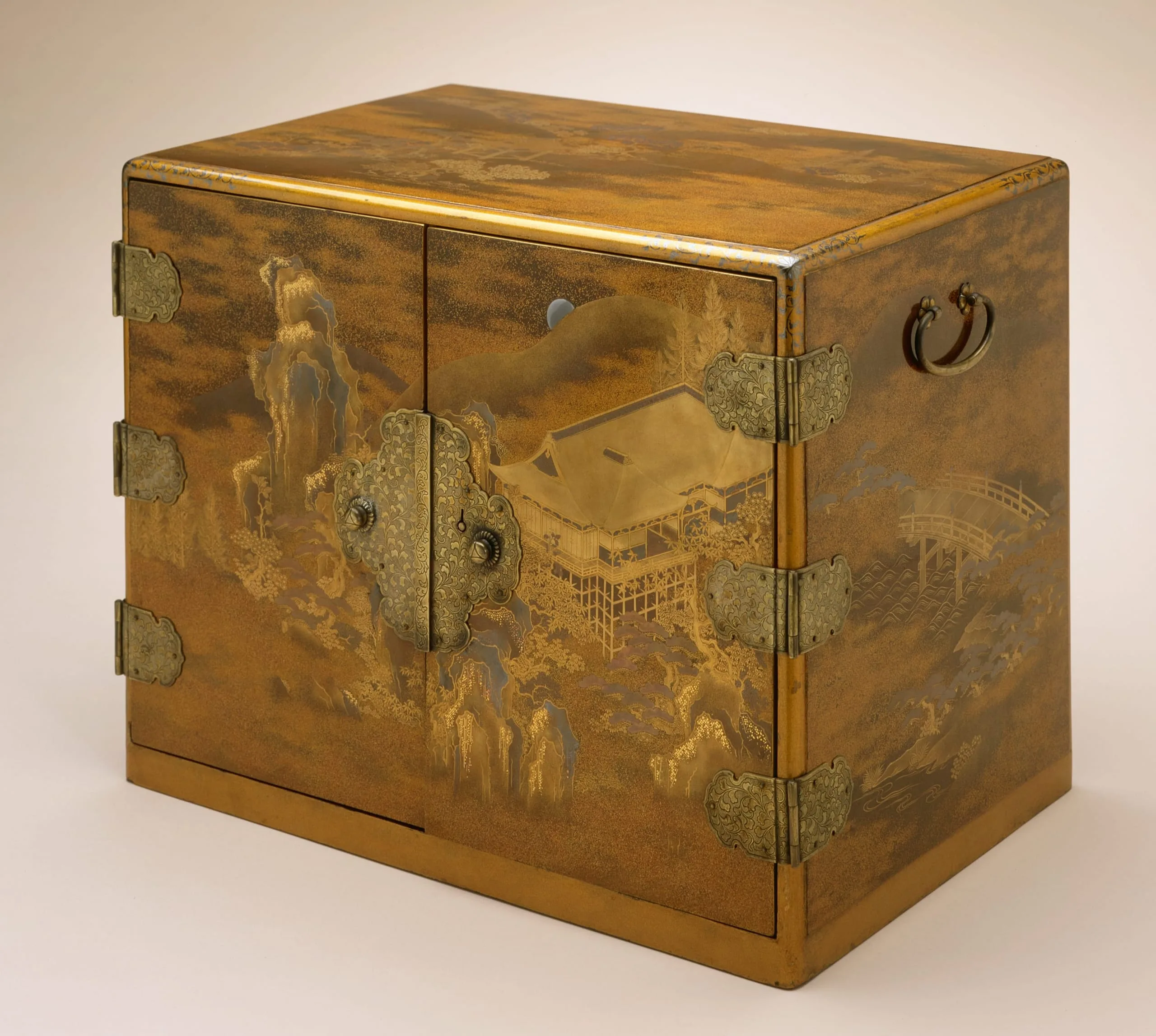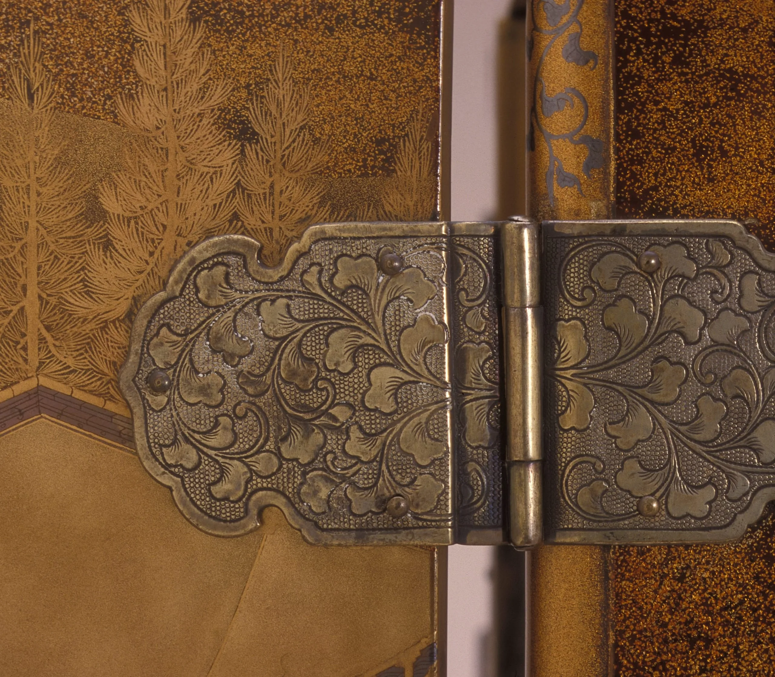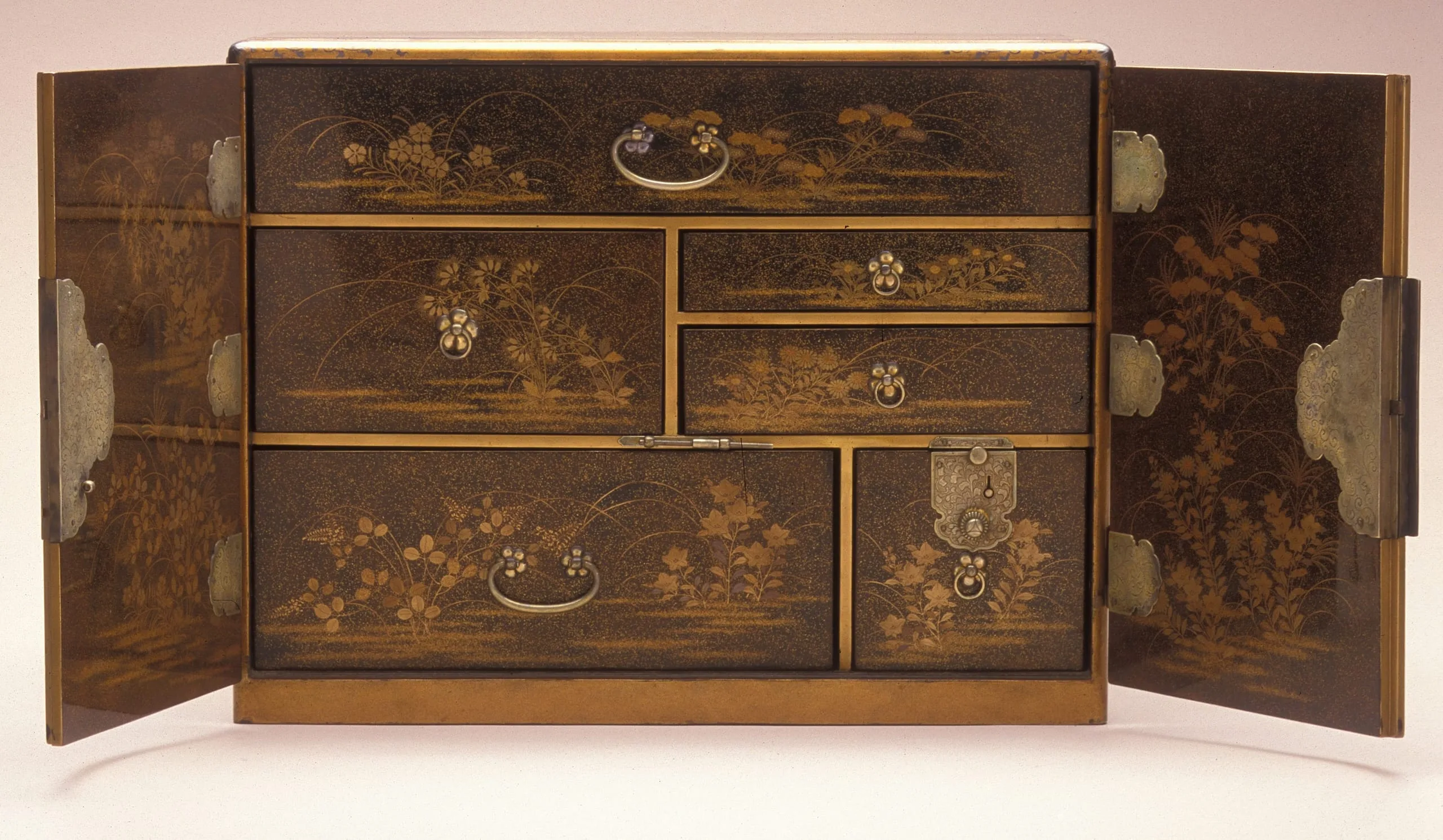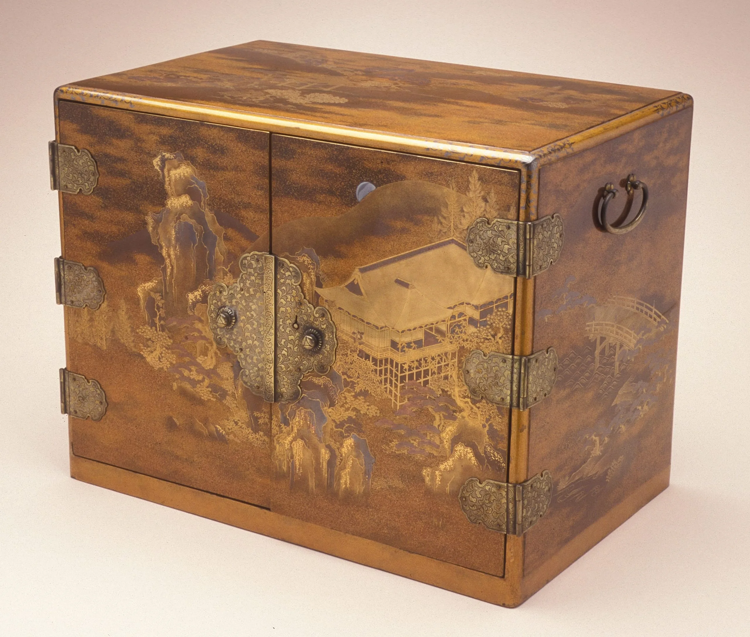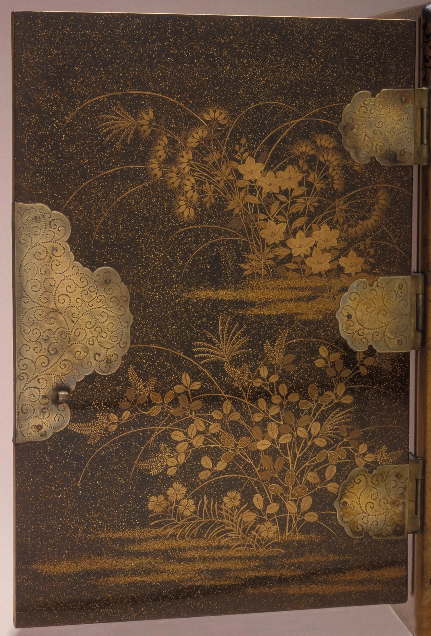 - Lacquer over wood; gold and silver leaf, flakes, and powder (makie); silver mounts