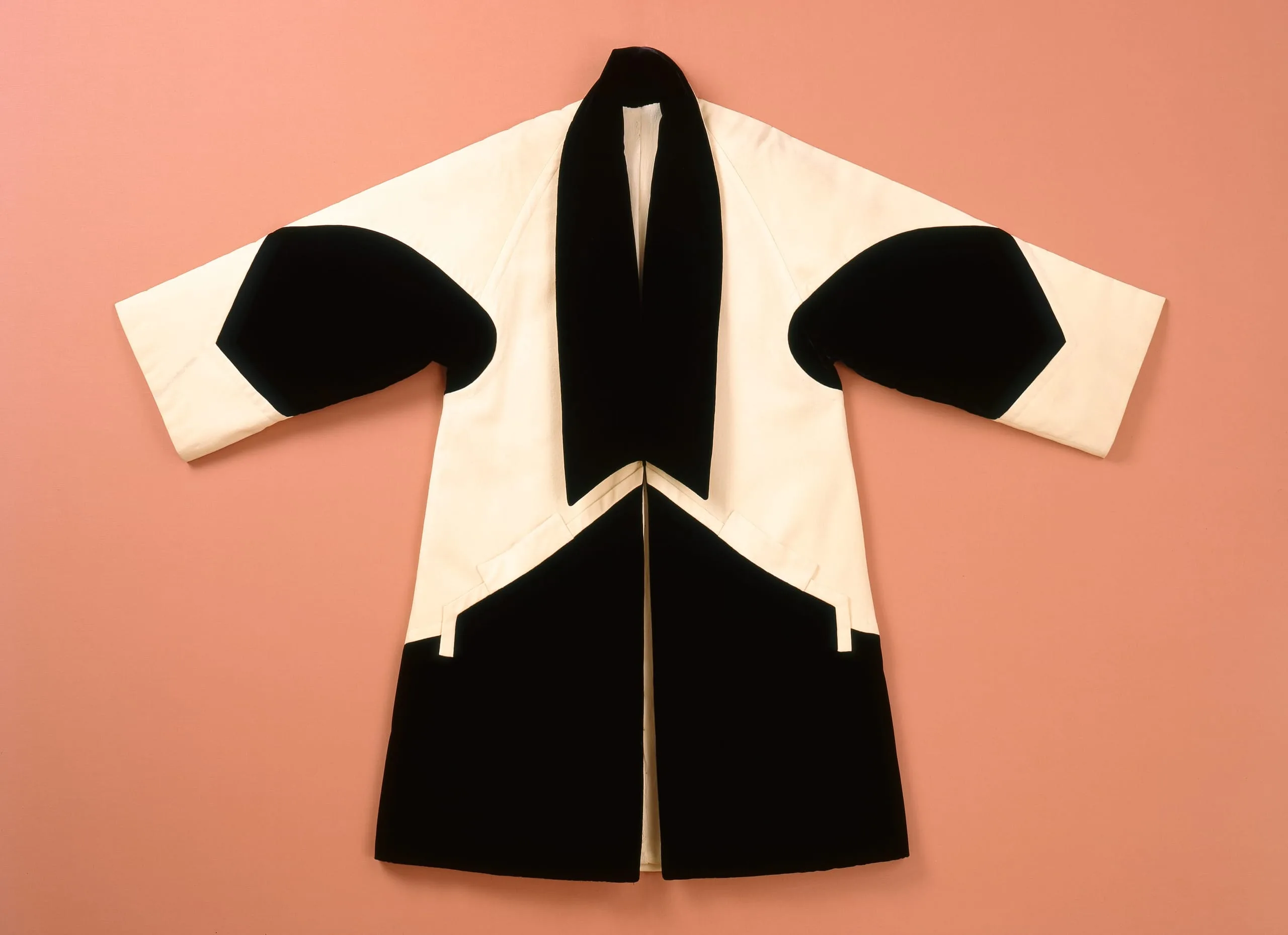 A flat-laid coat with a kimono-like silhouette in bold black and cream-white color blocks, with black velvet patches on the sleeves, collar, and lower body