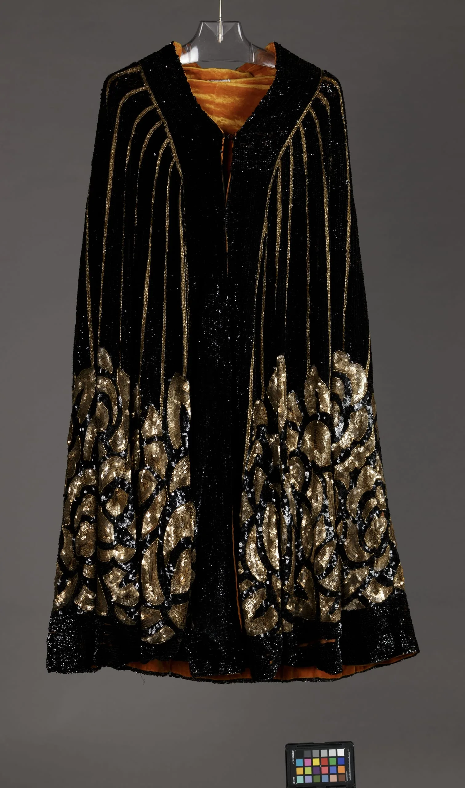 Full-length black velvet cape with amber-orange satin lining, decorated with gold cord trim in arching vertical lines and large scrolling sequined motifs along the lower hem