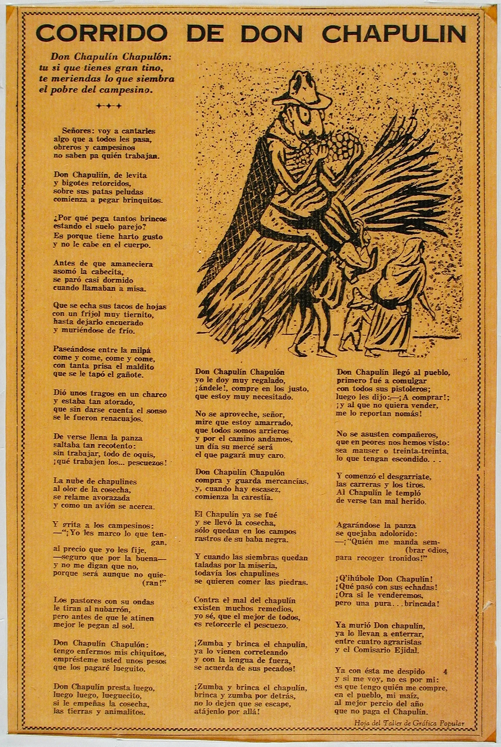 The corrido (ballad) was a favorite narrative device in TGP broadsides. Artists combined satirical images with the folk storytelling technique, using humor to address harsh political realities. The Corrido de Don Chapulín warns farmers against exploitation: Don Chapulín (Mr. Grasshopper), a pest that threatens farmers’ crops and livelihood, is a metaphor for the corrupt middleman. The TGP also used corrido broadsides to commemorate the Día de los Muertos (Day of the Dead), creating calaveras (animated skeletons) to illustrate current events. The formats of the corrido and calavera continued graphic traditions popularized by José Guadalupe Posada (1852–1913).