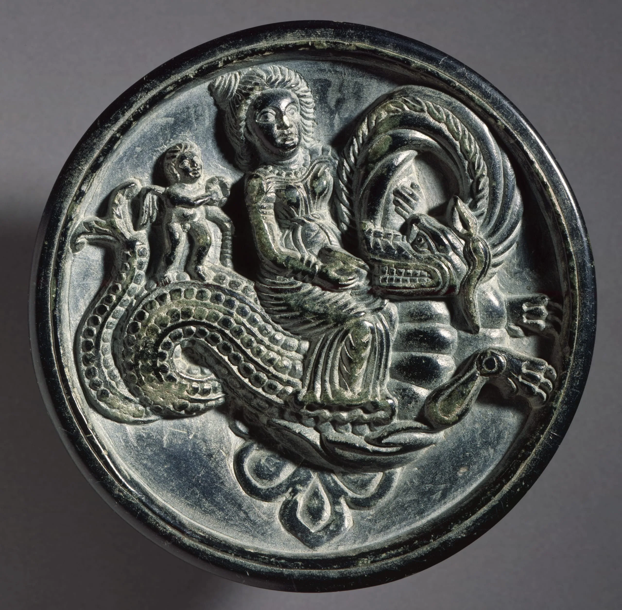 This ritual tray depicts a Greek mythological scene frequently portrayed in Western Classical art. A Nereid (sea nymph) elegantly garbed in a chiton rides the sea monster Keto with a dragon’s head and serpentine tail. The sea monster turns its head back towards the Nereid to receive a drink, oblation, or unguents from the bowl she holds. An adoring cherub stands behind her.