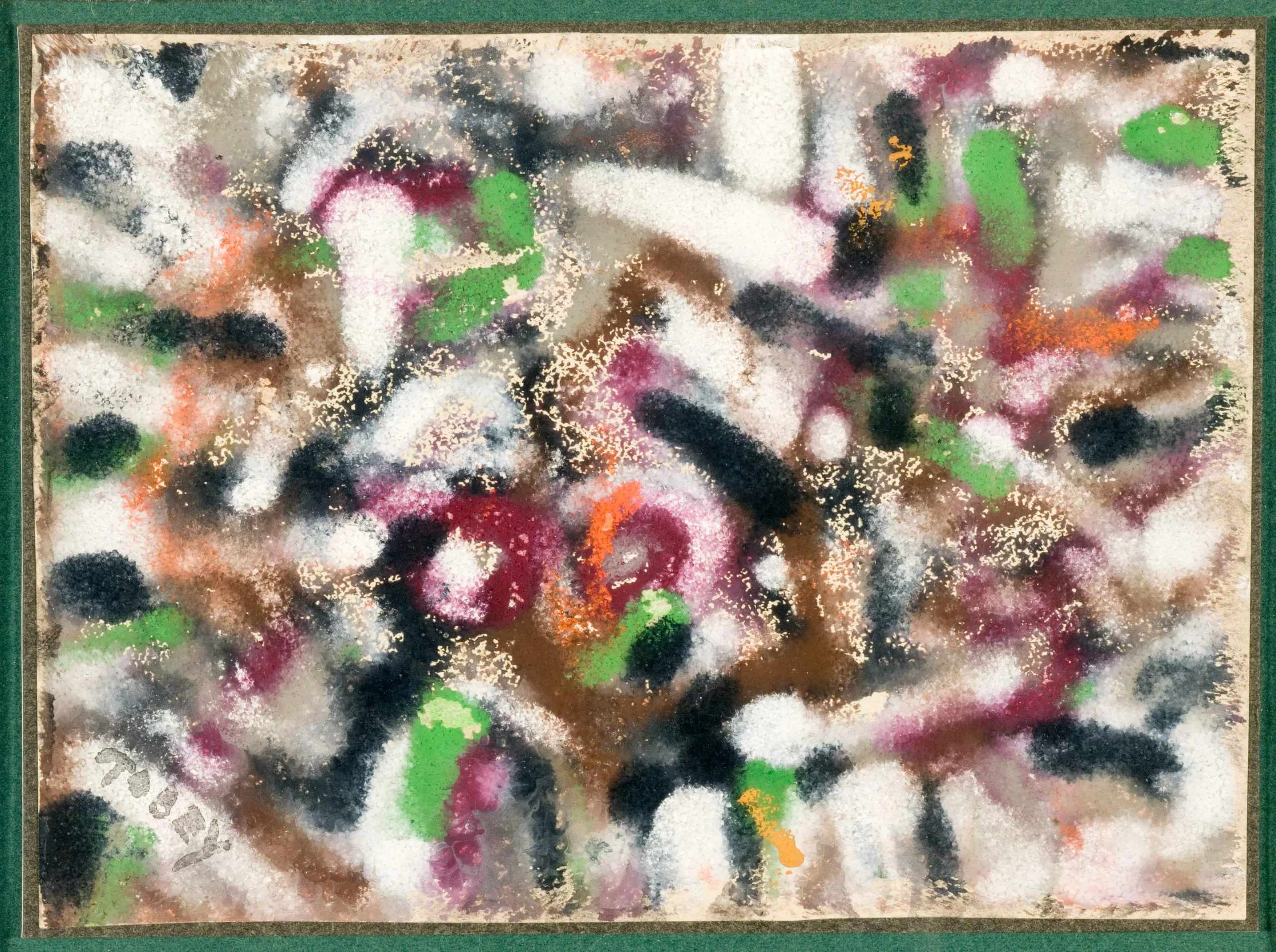 Horizontal abstract pastel or mixed-media work with densely layered soft-edged strokes in green, black, crimson, white, and orange over a tan ground, with a speckled chalky texture throughout