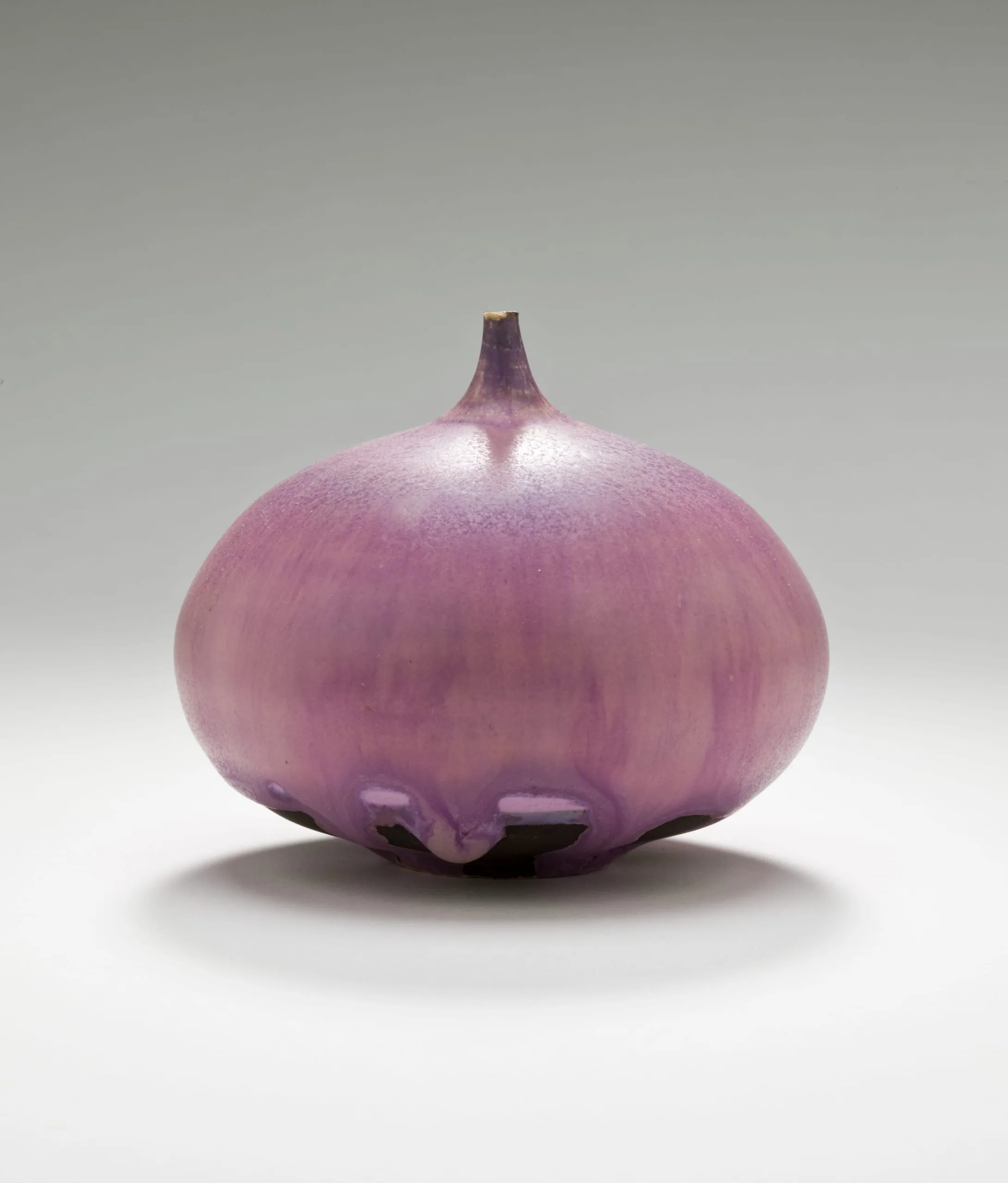 Ceramic vessel with round, bulbous form and short narrow neck, covered in a matte mauve-purple glaze with scalloped foot