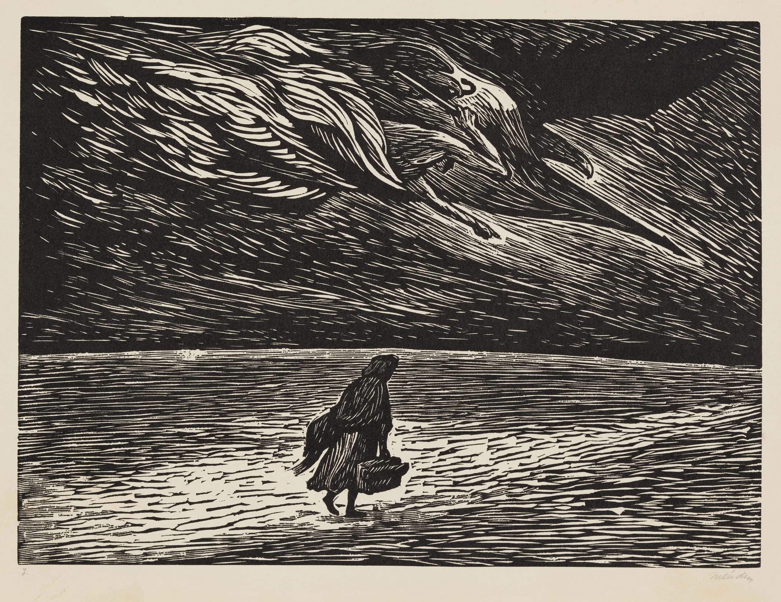 In Little School Teacher, How Immense Is Thy Will! (Pequeña maestra, ¡qué inmensa es tu voluntad!), Méndez shows the film’s protagonist (played by Mexican movie star María Félix) beginning a long trek to the town where she has been dispatched to teach. Wrapped in a rebozo (shawl), the diminutive teacher trudges through an immense, barren landscape—imagery taken directly from the film. Overhead, Méndez introduces a soaring eagle and a figure carrying the Mexican flag. Méndez had long aspired to make graphic murals and to create prints on a monumental scale; the horizontal format, dramatic chiaroscuro, and overall sense of dynamism lend the work a cinematic quality.