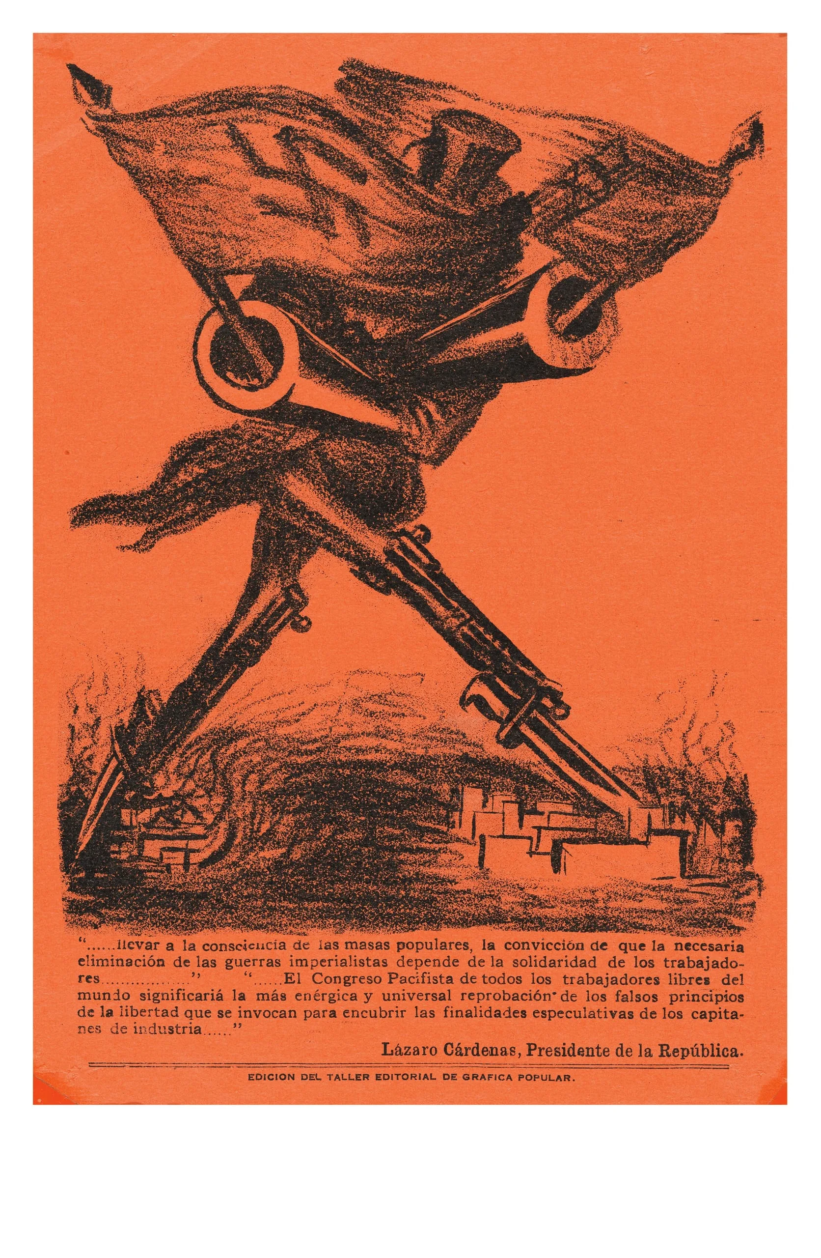 In 1938 artists of Mexico City’s Taller de Gráfica Popular (TGP; People’s Print Workshop) watched with great concern as civil war raged in Spain and Europe barreled toward World War II. The TGP’s anti-fascist anxieties are encapsulated in this image by Leopoldo Méndez. A menacing figure strides over a burning town. His legs have been replaced by a pair of rifles with bayonets that pierce the smoldering buildings, and his arms are cannons from which flags emerge. The Nazi swastika is visible on the left flag and the right flag bears a fasces (a bundle of sticks), a symbol of Italian fascism under Benito Mussolini (1883–1945). While the flags obscure the figure’s face, his top hat and coattails are visible, connecting him to the wealthy class of industrial leaders and identifying fascism and imperialism as equal threats to freedom.