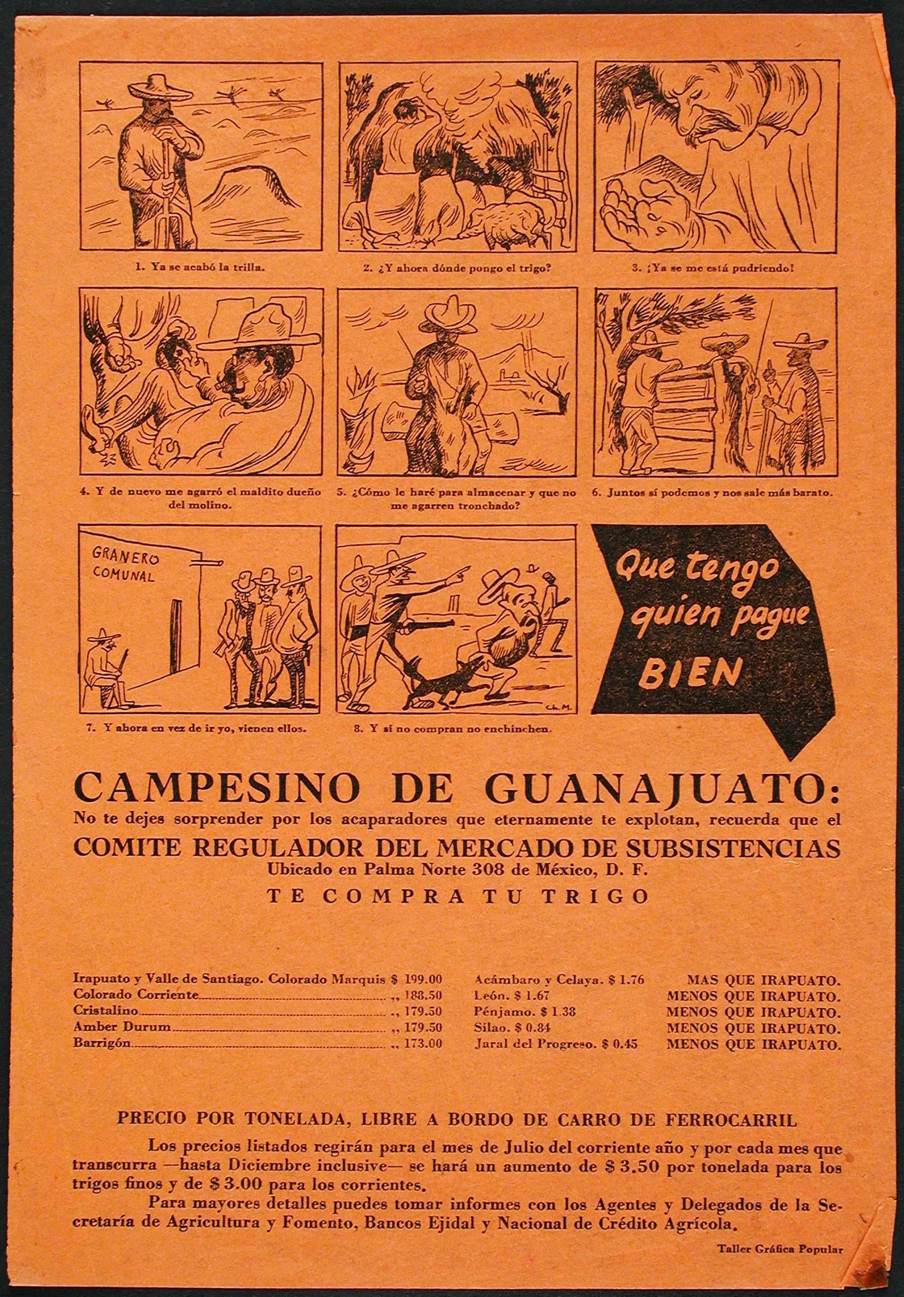 Linocut or woodcut print on orange paper with eight illustrated panels showing Mexican farmers and grain storage scenes, above Spanish-language text advertising wheat purchase prices