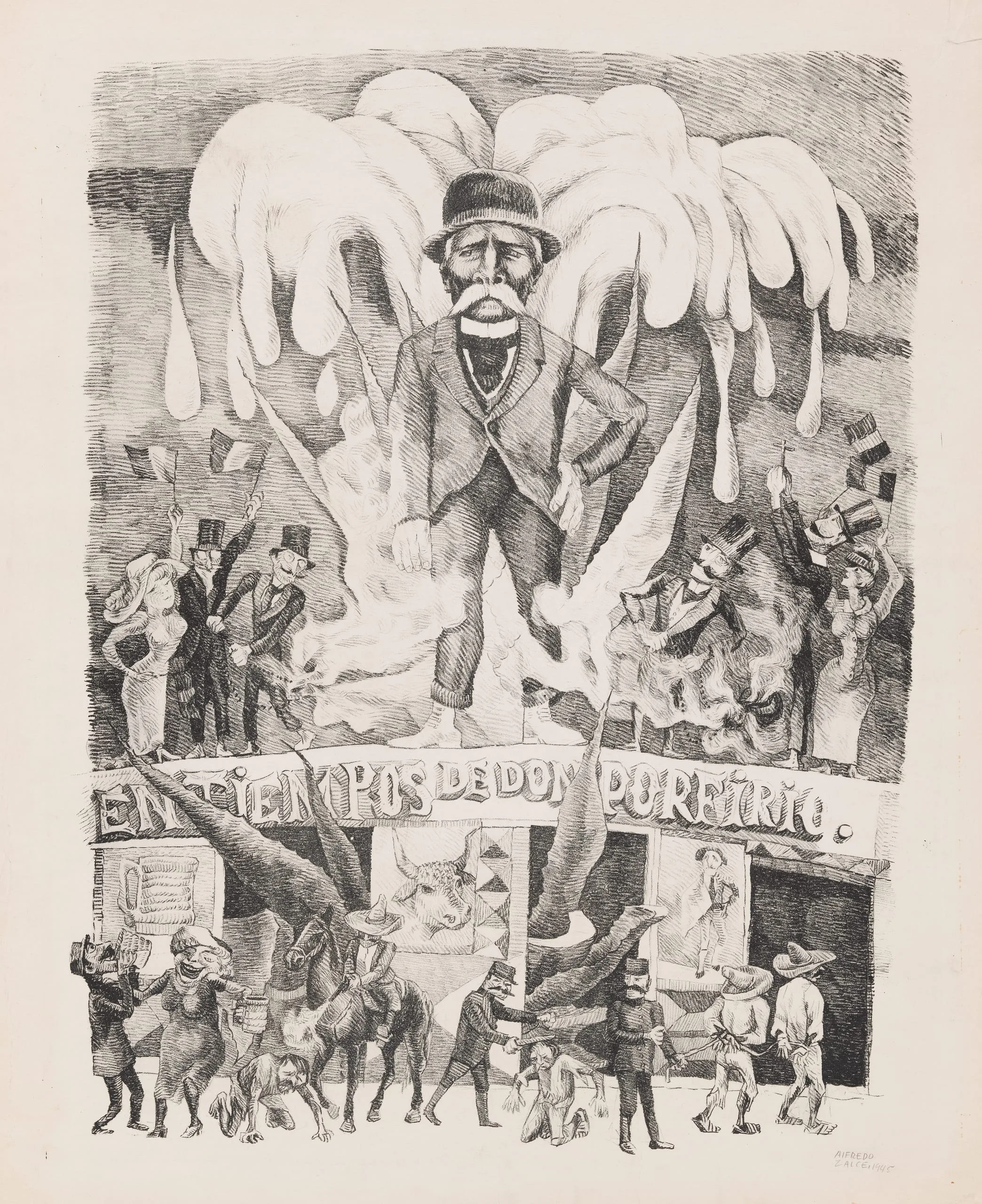 General Porfirio Díaz (1830–1915) was formally elected president of Mexico in 1877. After appointing his successor, Díaz ran again in 1884 and remained in office until he was forced to resign in 1911. During Díaz’s authoritarian regime, known as the Porfiriato, the country experienced growth and prosperity, but this progress was achieved through the exploitation of Indigenous and working-class Mexicans. In this satirical image, Alfredo Zalce highlights this schism through references to pulque, a fermented alcoholic drink made from the maguey plant. A sacred beverage consumed by the Indigenous elite before the conquest, pulque was largely associated with the Indigenous population in colonial and post-revolutionary times. During the Porfiriato, wealthy hacienda owners profited from the lucrative pulque industry while campaigns against inebriation targeted lower-class drinkers. In the decades following the revolution, pulque and the maguey from which it was extracted became national symbols, despite the fact that the drink’s consumption and noxious effects were topics of ongoing debate.