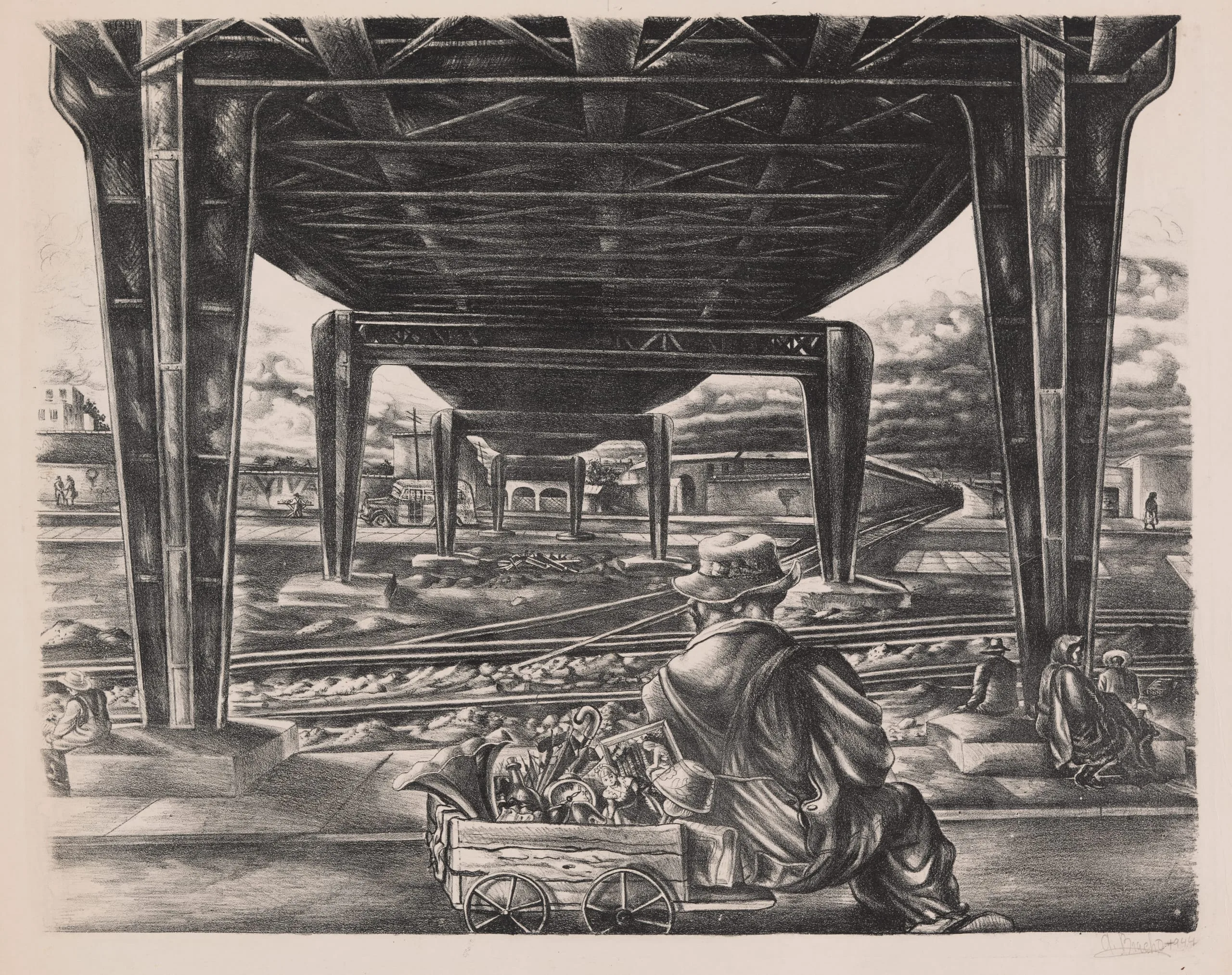 Four years after the completion of the overpass, Ángel Bracho depicted its underside, focusing on the lives lived beneath the bridge. In the foreground of this print a peddler sits with his back to the viewer, resting on the wagon that contains his latest wares, previously collected and discarded by the city’s wealthier citizens. As the bridge looms overhead, Bracho questions the progress it represents, with economic and industrial development being prioritized over social reform and well-being.