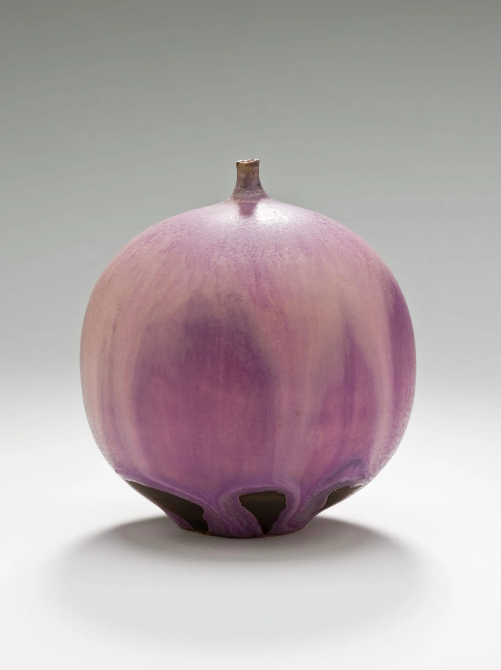 Ceramic vessel with a globular, lobed body covered in a lavender-to-plum glaze, with a tiny unglazed neck and scalloped cutout base revealing dark brown clay