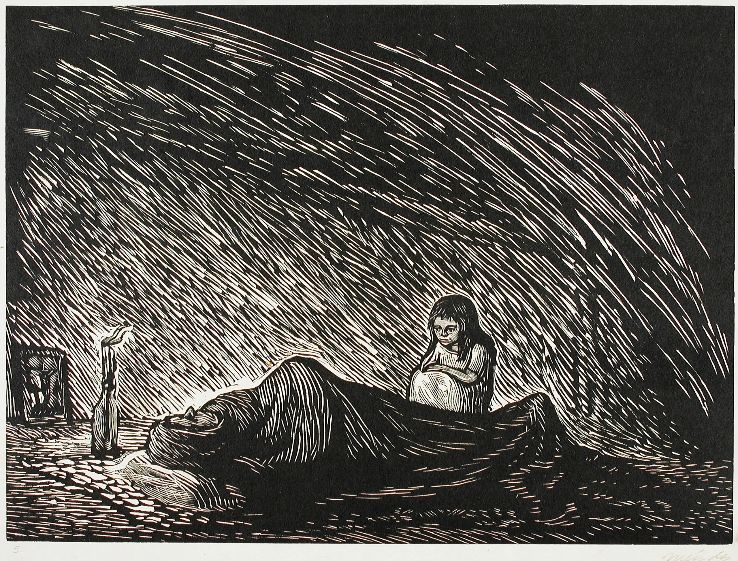 The film features celebrated movie star María Félix (1914–2002), who plays a maestra rural (rural schoolteacher) sent by the president of the republic to a remote village run by a despotic leader. When she arrives, she encounters three young siblings and their mother who is dying of smallpox. In this image, Méndez depicts the daughter sitting vigil over her ailing mother. The dark background and sparse composition heighten the girl’s grief.