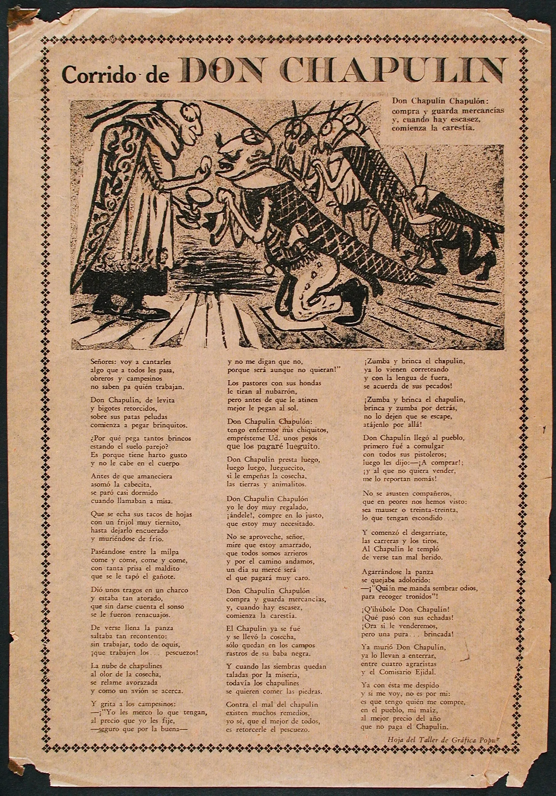 The corrido (ballad) was a favorite narrative device in TGP broadsides. Artists combined satirical images with the folk storytelling technique, using humor to address harsh political realities. The Corrido de Don Chapulín warns farmers against exploitation: Don Chapulín (Mr. Grasshopper), a pest that threatens farmers’ crops and livelihood, is a metaphor for the corrupt middleman. The TGP also used corrido broadsides to commemorate the Día de los Muertos (Day of the Dead), creating calaveras (animated skeletons) to illustrate current events. The formats of the corrido and calavera continued graphic traditions popularized by José Guadalupe Posada (1852–1913).