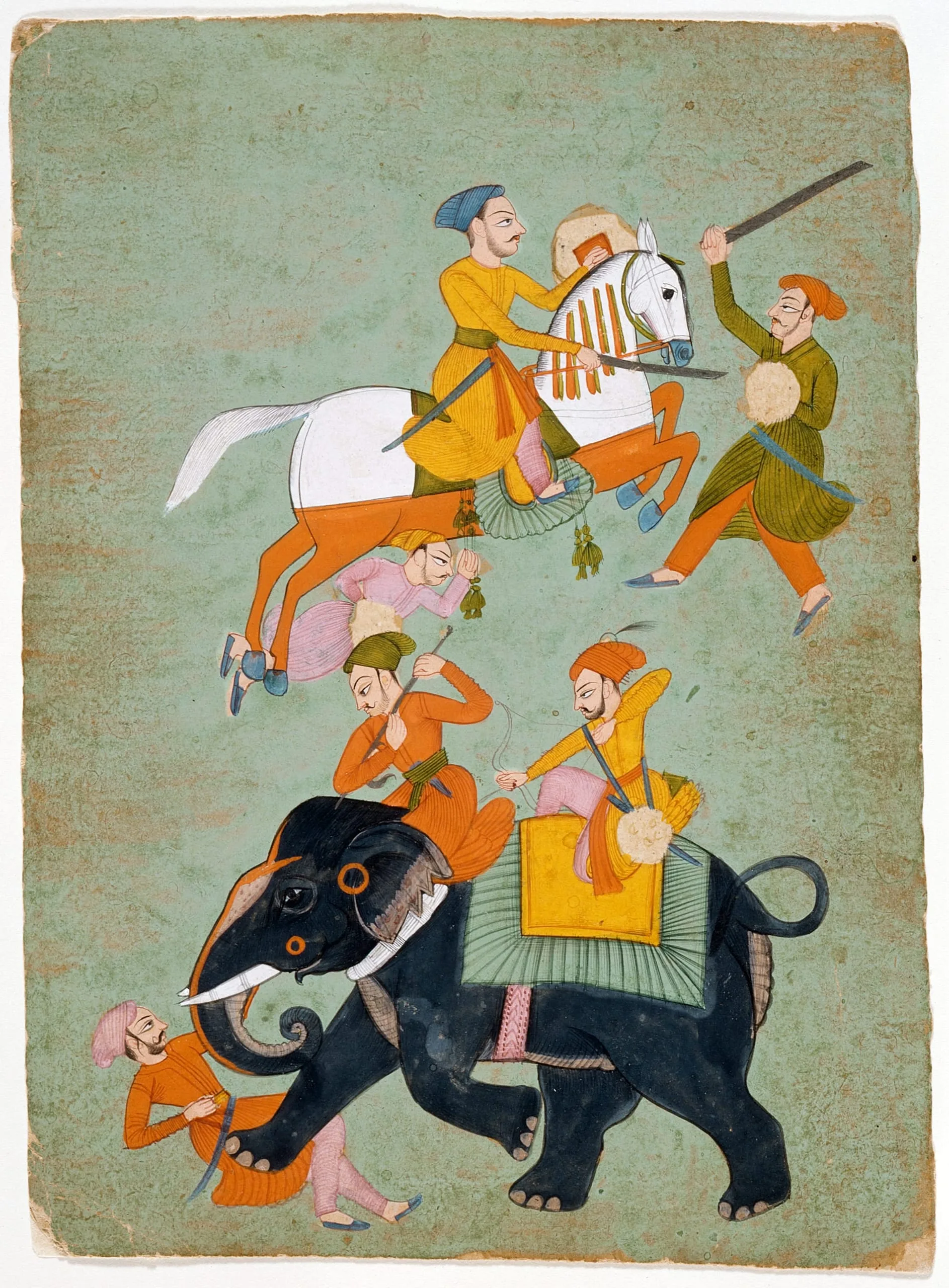 The elephant, valued for its monumentality and strength, was the most frequently depicted animal in Mughal and Rajput paintings. Elephants are shown in various activities, including processions and hunts, combats with one another, and as in this case, war.