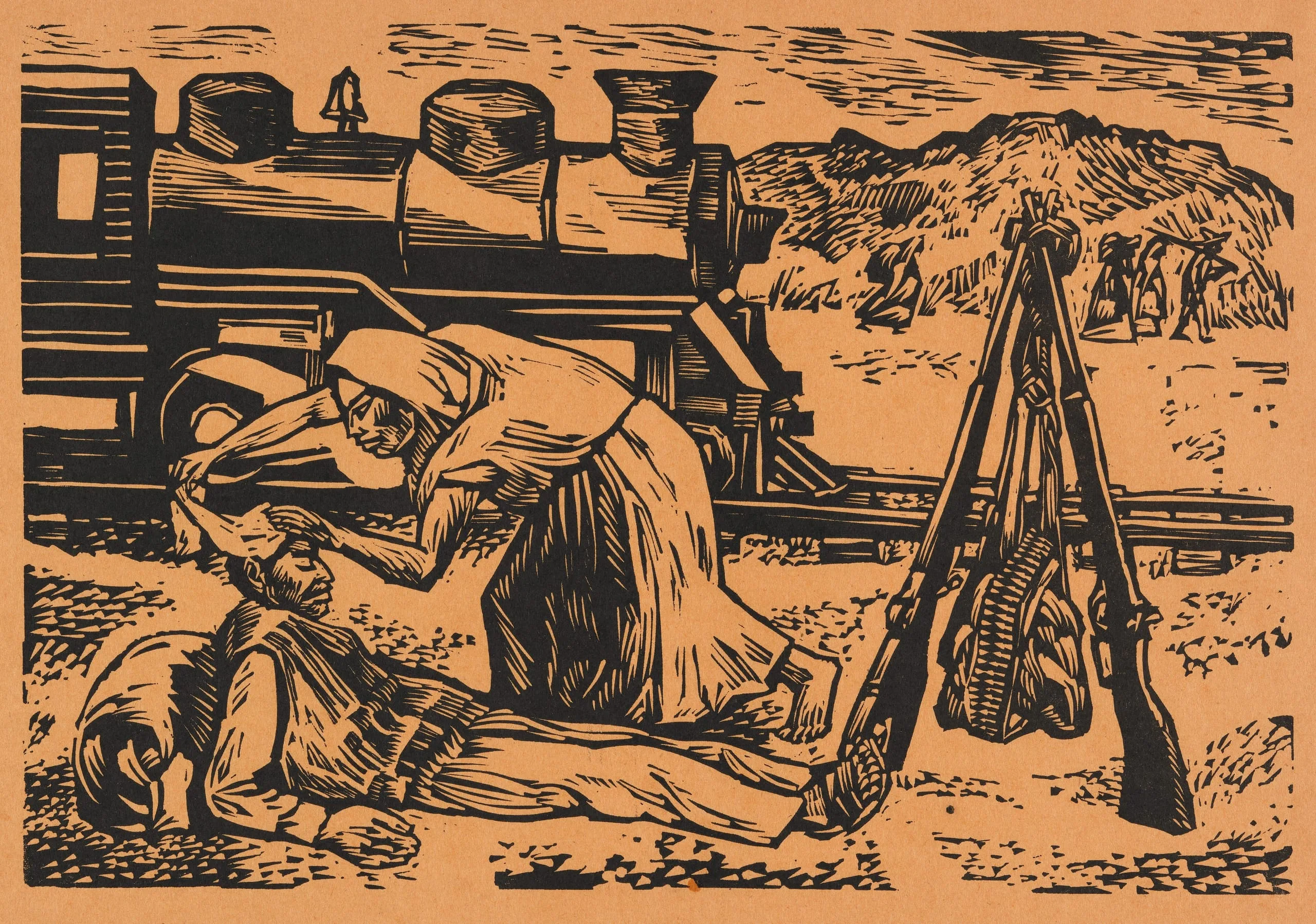 Women were active participants in the Mexican Revolution. Lower-class women, especially, filled various roles—such as soldiers, nurses, and cooks—and provided care and supplies to the troops. Such women were known by several names including soldaderas (female soldiers), camp followers, and Adelitas. Popularized through corridos (ballads) and photographs, the Adelita archetype became an allegorical and romanticized icon of the revolution. In this image, Alfredo Zalce honors the soldadera and alludes to her many roles. Here, she tends to the head wound of an injured soldier next to two rifles, one of which may be hers.