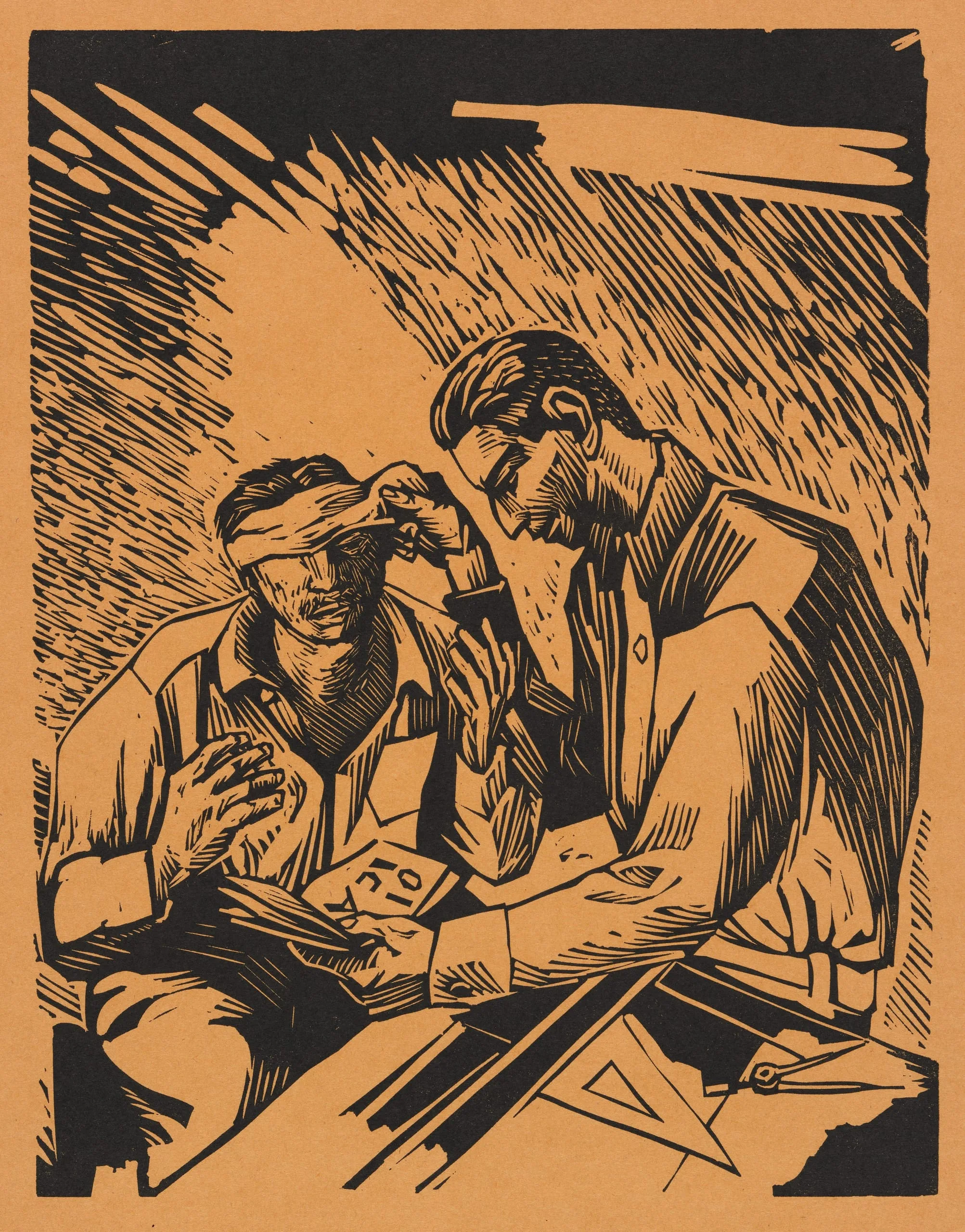 Alfredo Zalce represented the literacy campaign in this linocut for the Estampas de la Revolución Mexicana (Prints of the Mexican Revolution) portfolio. A man teaches his friend how to read from a primer, perhaps one of the very publications illustrated by members of the TGP. As he does, he lifts the blindfold from his companion’s eyes, symbolically showing him the new world of understanding that literacy would bring.
