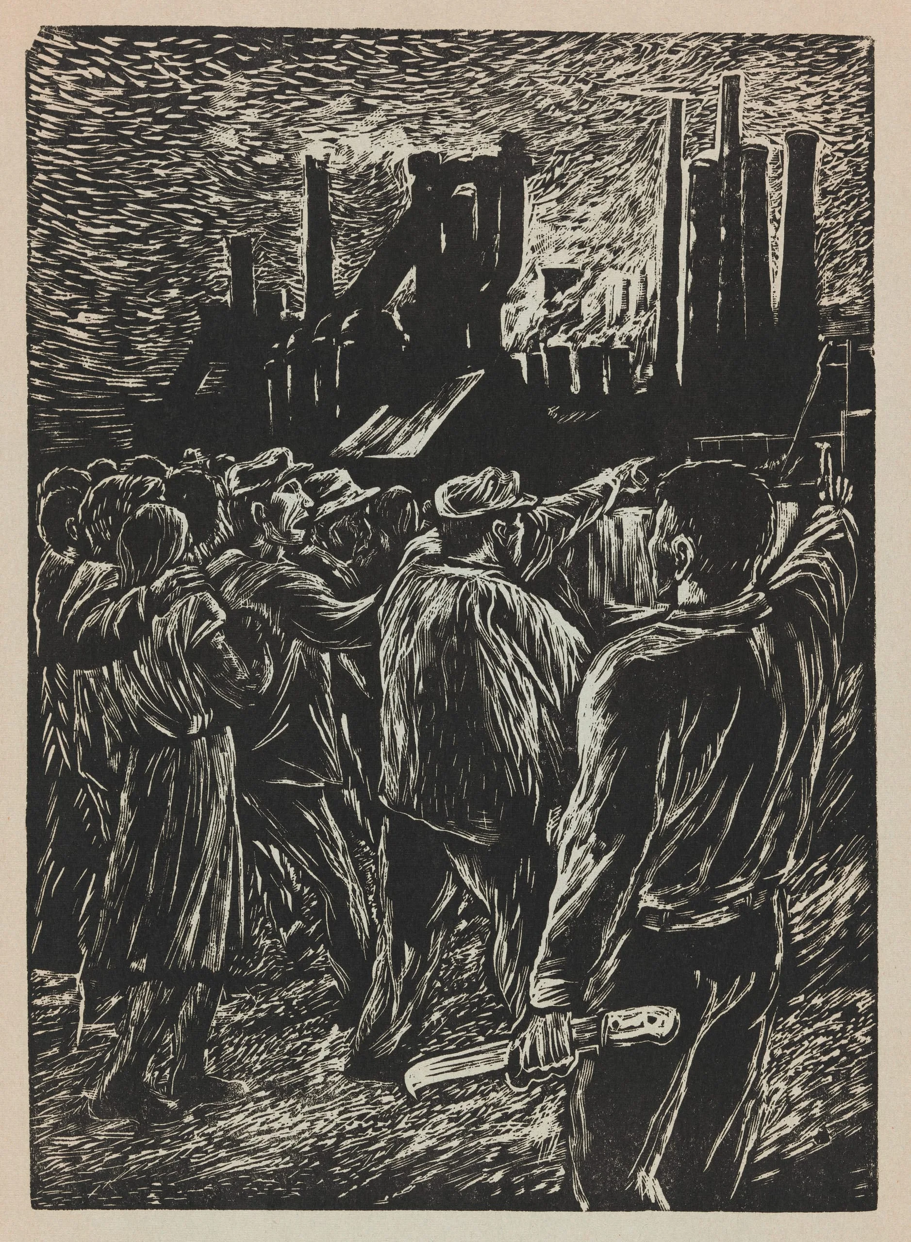 This linocut by Arturo García Bustos is the final print in Estampas de la Revolución Mexicana (Prints of the Mexican Revolution), a collective portfolio by the Taller de Gráfica Popular (People’s Print Workshop) that presented seventy years of revolutionary and counterrevolutionary activity in Mexico. Here, García Bustos depicts a group of workers—with their arms raised and backs turned from the viewer—walking toward the silhouetted smokestacks of a factory. The caption in the portfolio’s accompanying booklet credits the country’s industrialization both to the leadership of President Miguel Alemán (1903–1983) and to the “anhelo del pueblo” (the people’s longing). Industrialization is celebrated as a revolutionary way for Mexico to achieve economic independence. However, the image also has ominous overtones, from the clusters of frenetic marks that suggest pollution entering the dark sky to the figure in the foreground who dangerously grips his knife by the blade instead of its handle.