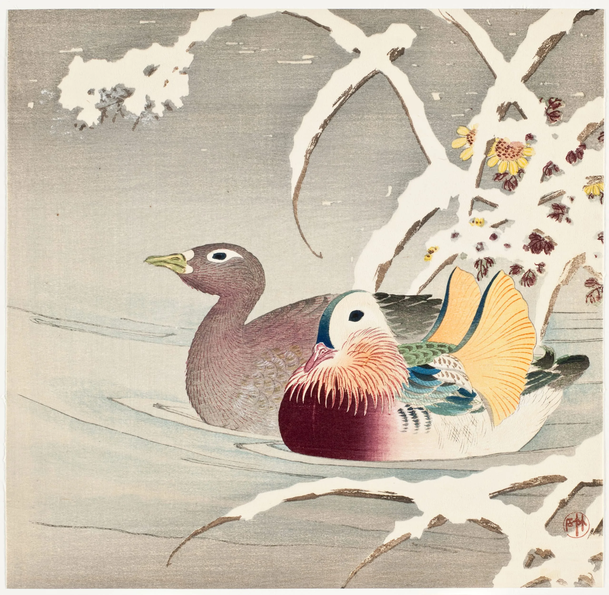 - Mandarin Ducks and Snow-Covered Reeds