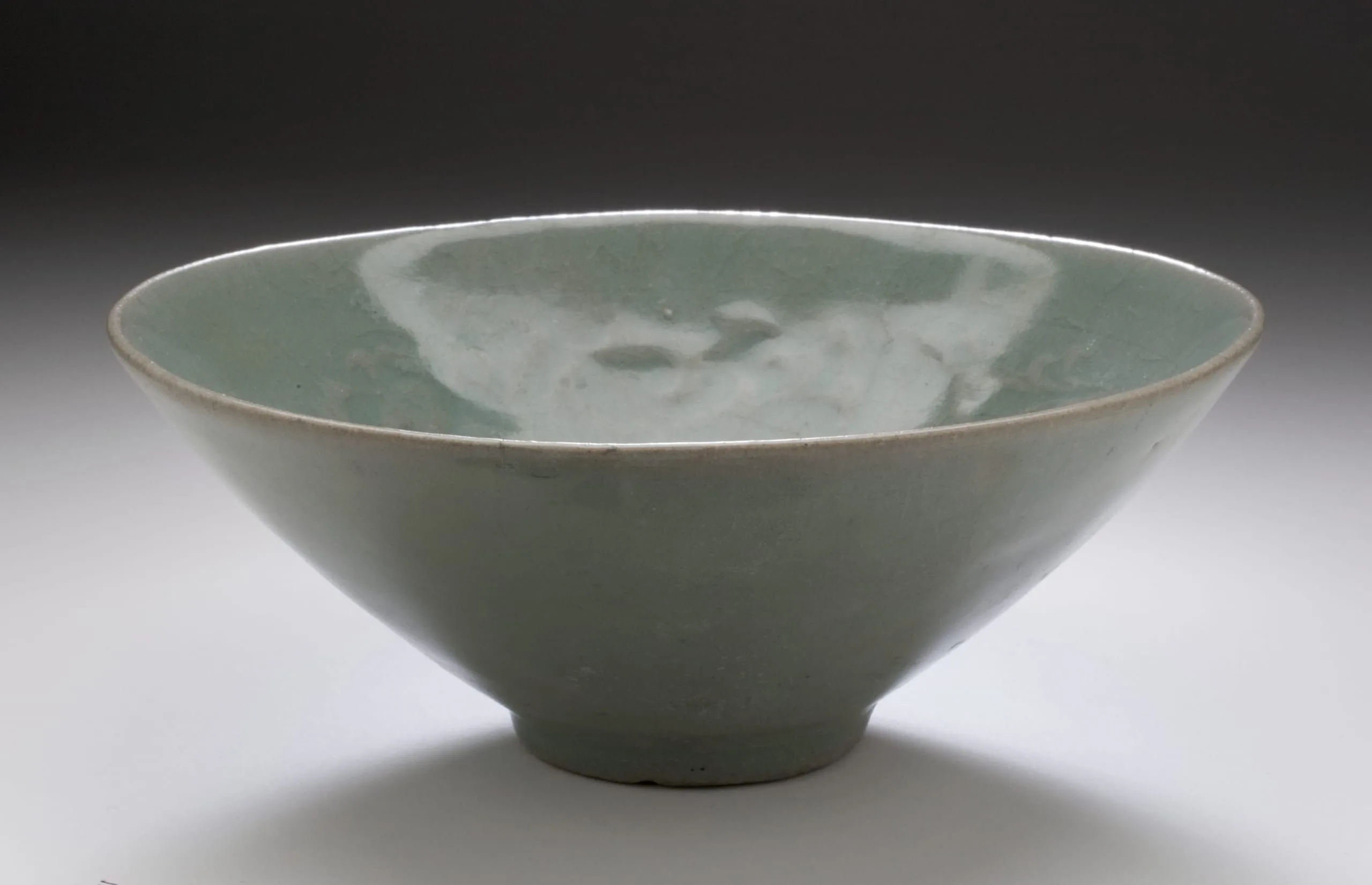 - Wheel-thrown stoneware with carved decoration and celadon glaze