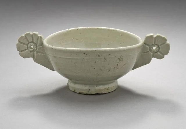 - Wheel-thrown stoneware with applied and carved decoration and cream glaze