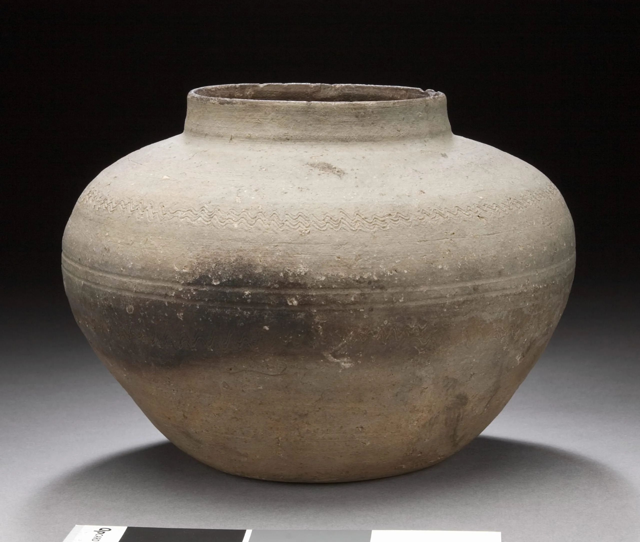 - Wheel-thrown stoneware with combed decoration