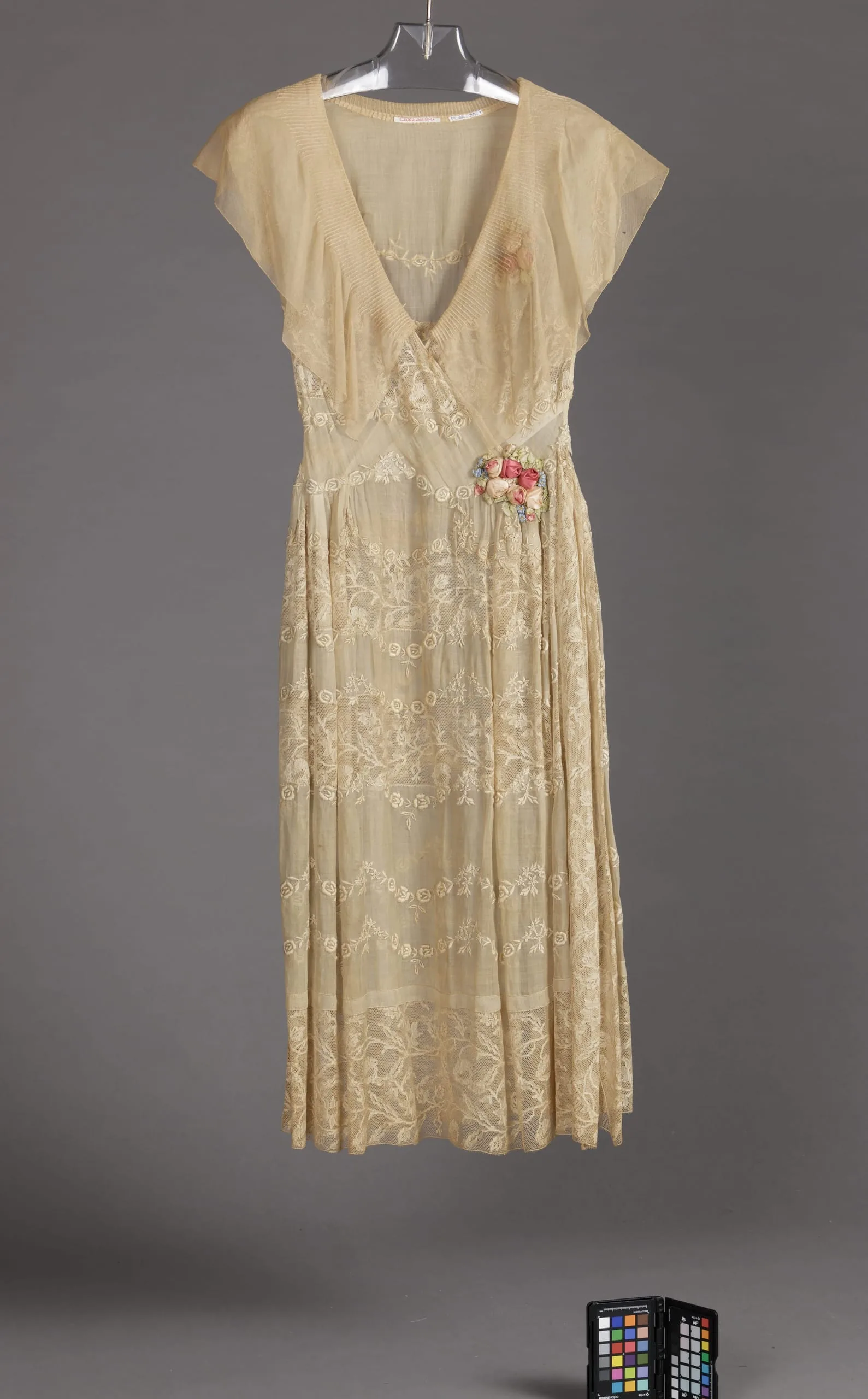 - Dress: cotton plain weave with cotton embroidery, linen lace, silk tulle, and silk ribbon rosettes; Slip: silk satin