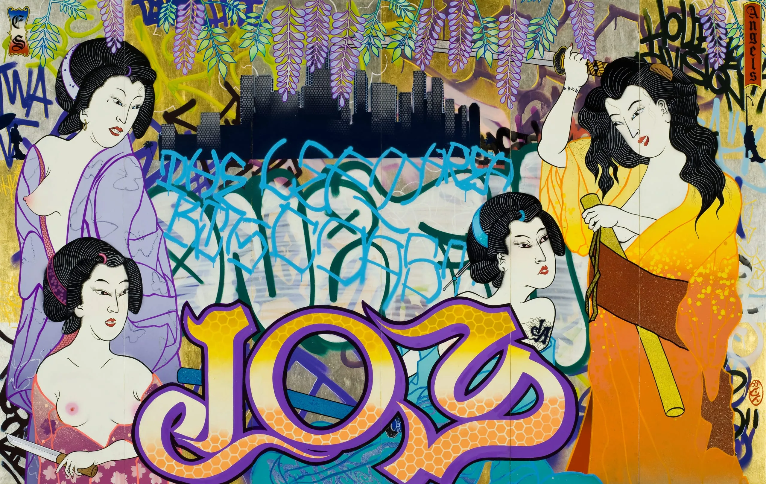 - Acrylic, spray paint, white gold, and gold leaf on wood panel