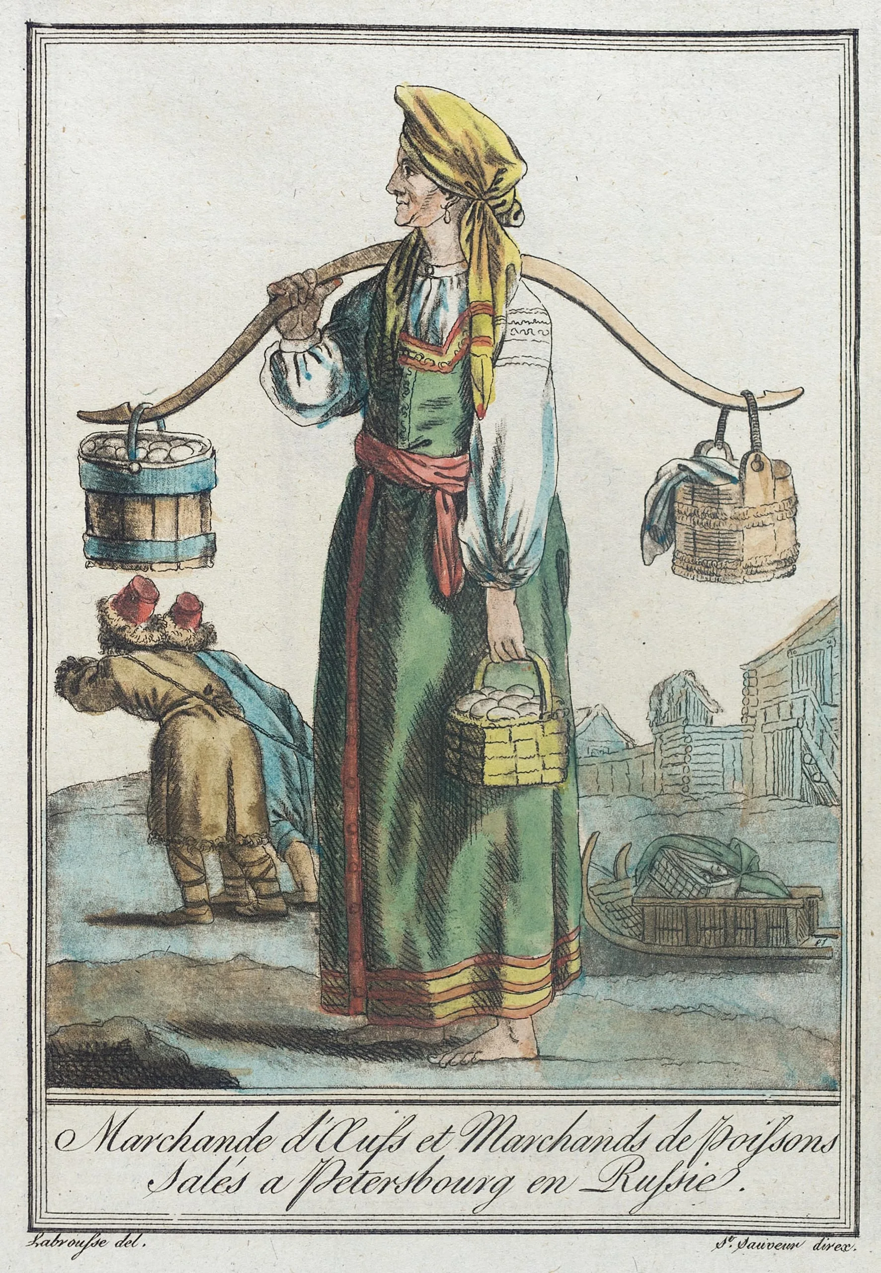 - Costumes de Différents Pays, 'Marchande d'Auss et Marchands de Poissons Salés a Petersbourg en Russie'