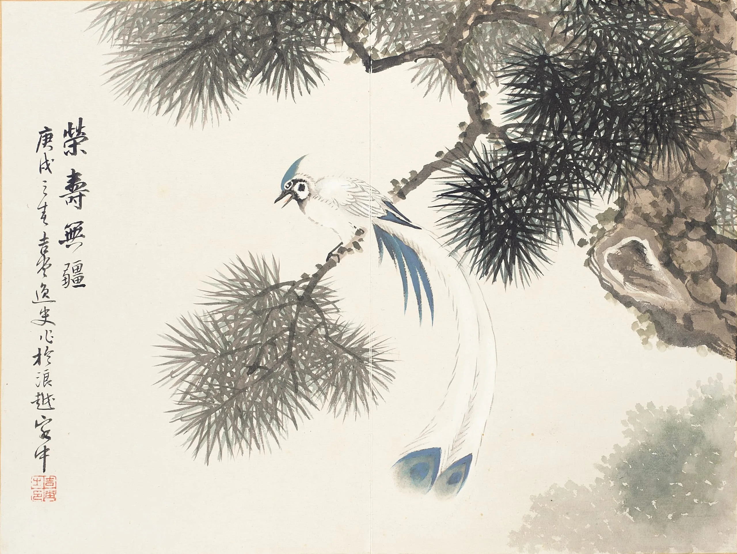 Chinese ink and color painting on paper of a long-tailed white bird with blue markings perched on a pine branch, with calligraphic inscription and red seal at left