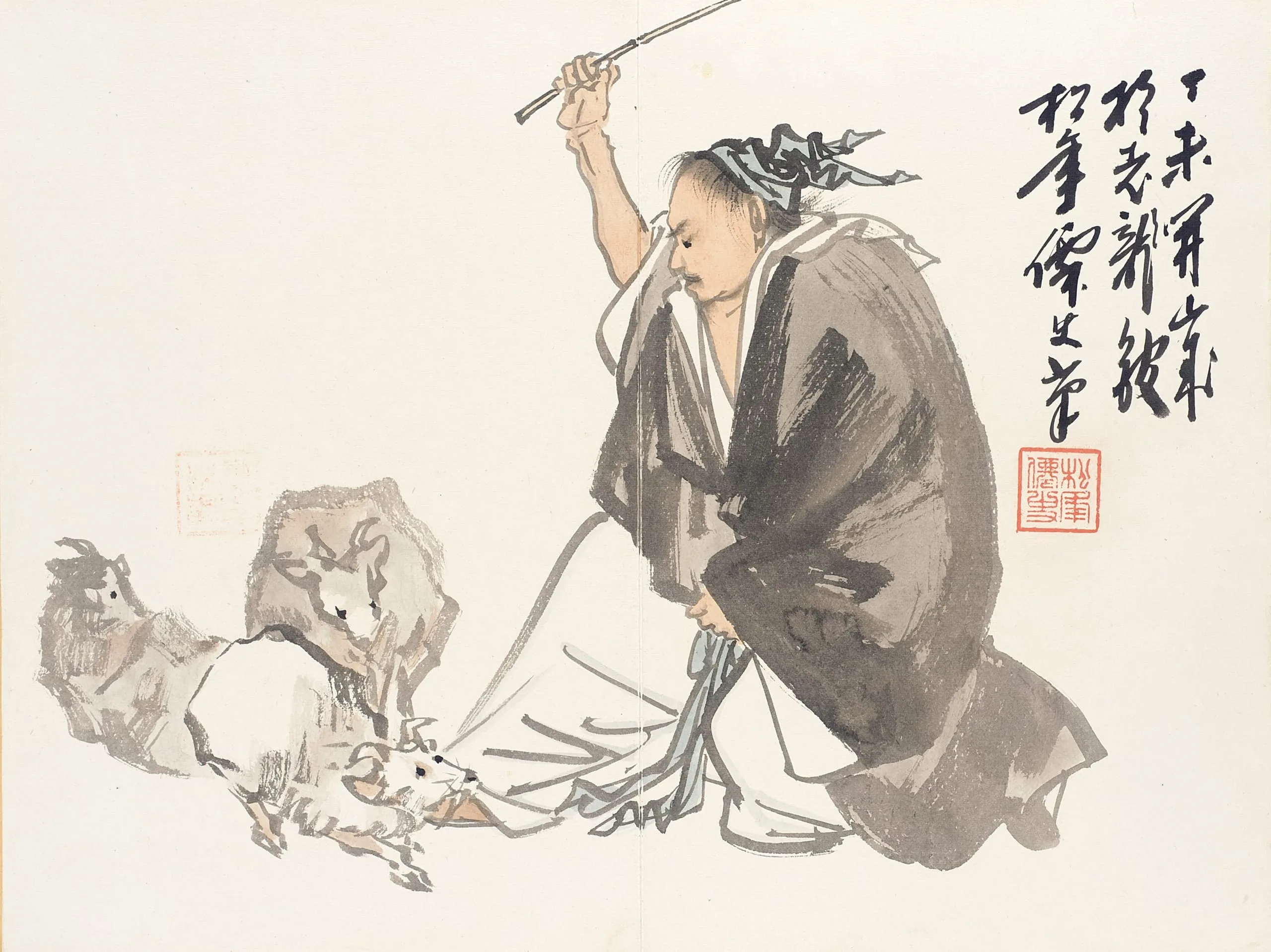 Ink and wash painting on cream paper, kneeling robed figure raising a rod over two dogs, with East Asian calligraphy and red seals at upper right