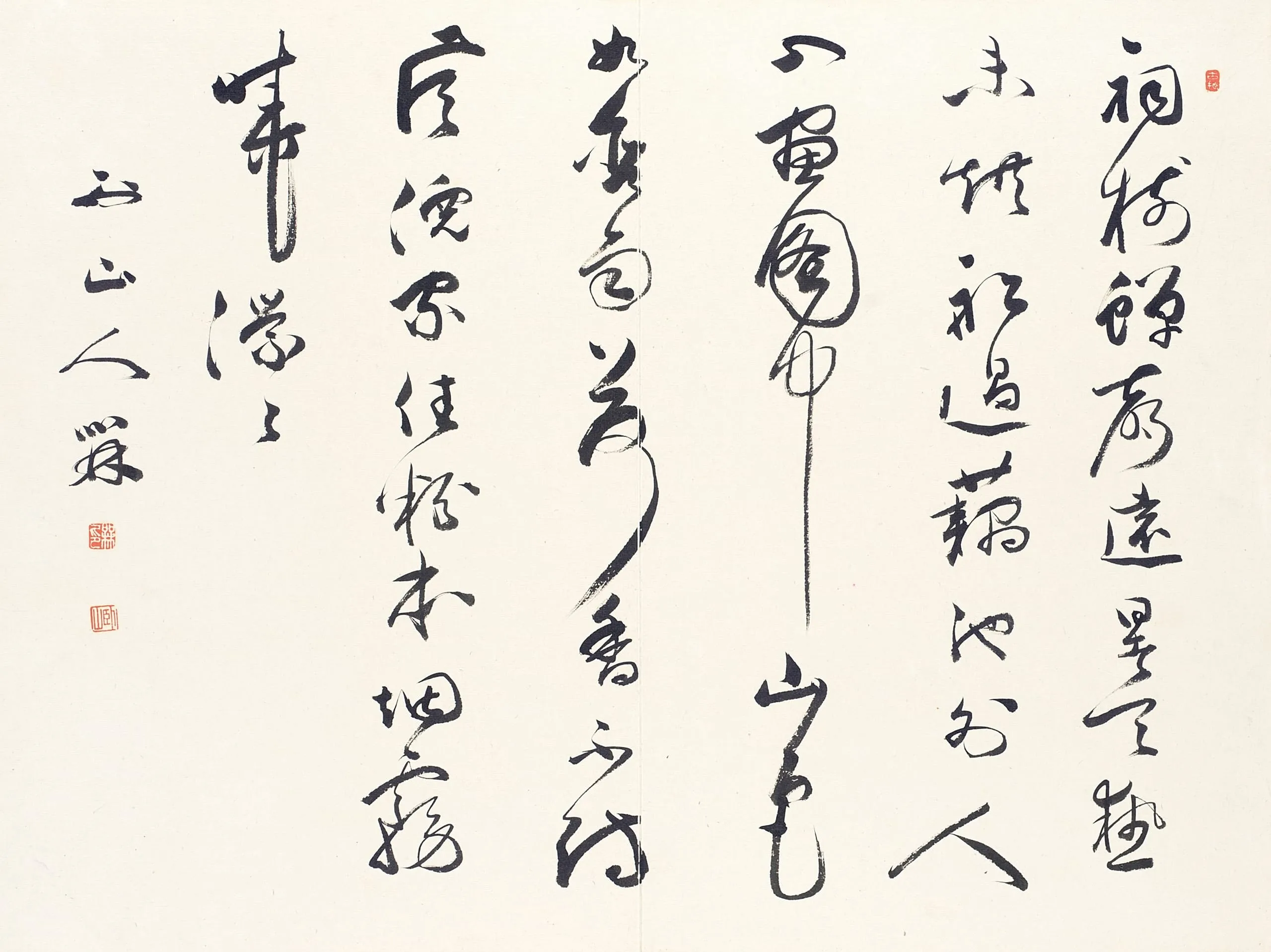 Chinese cursive-script calligraphy in black ink on cream paper, six columns of flowing caoshu brushwork reading right to left, with a signature and two red seals at lower left