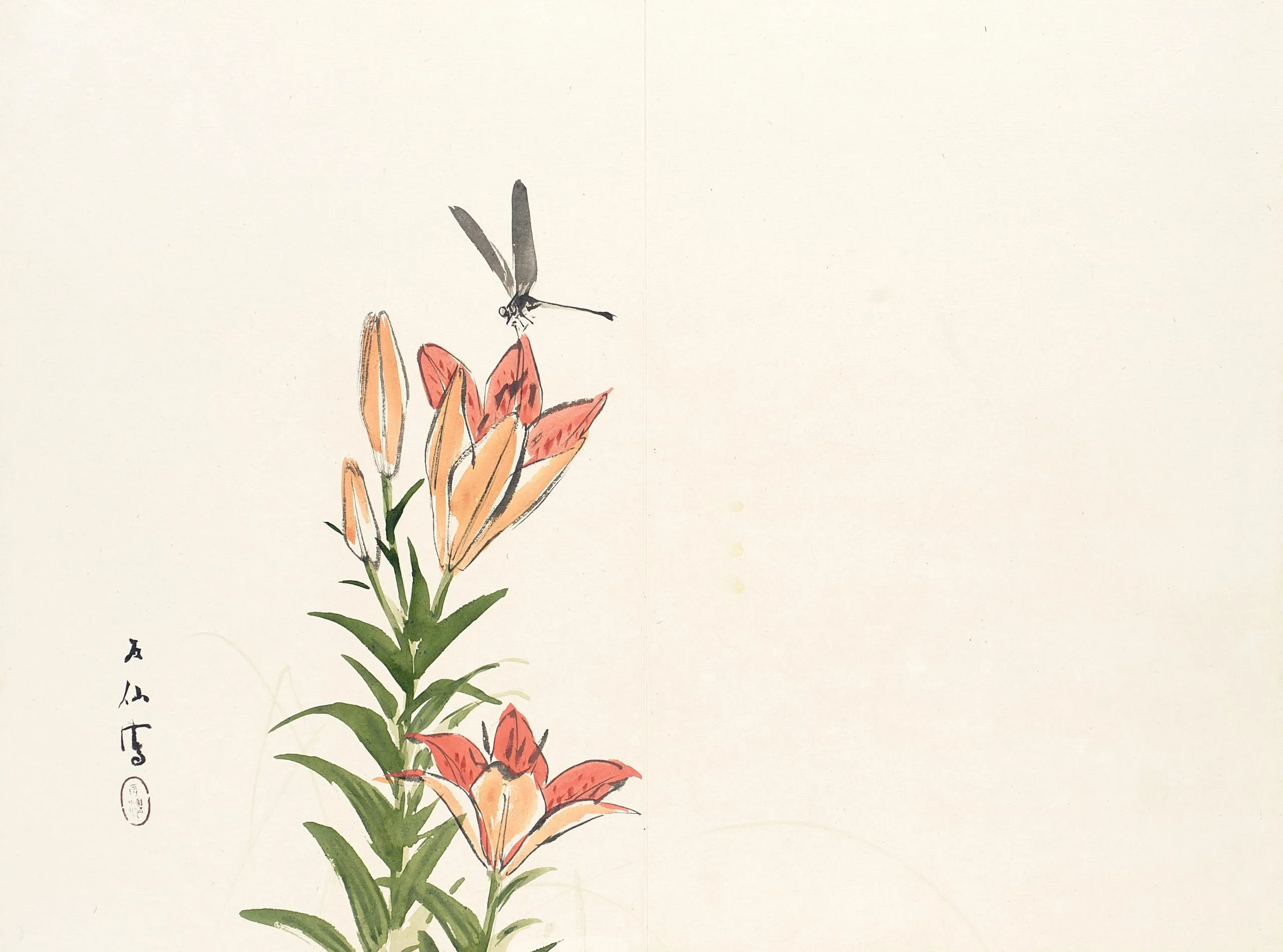 Ink and color wash drawing of a lily plant with coral-red blooms and a dragonfly perched at the top, on cream paper, with a vertical East Asian inscription and red seal