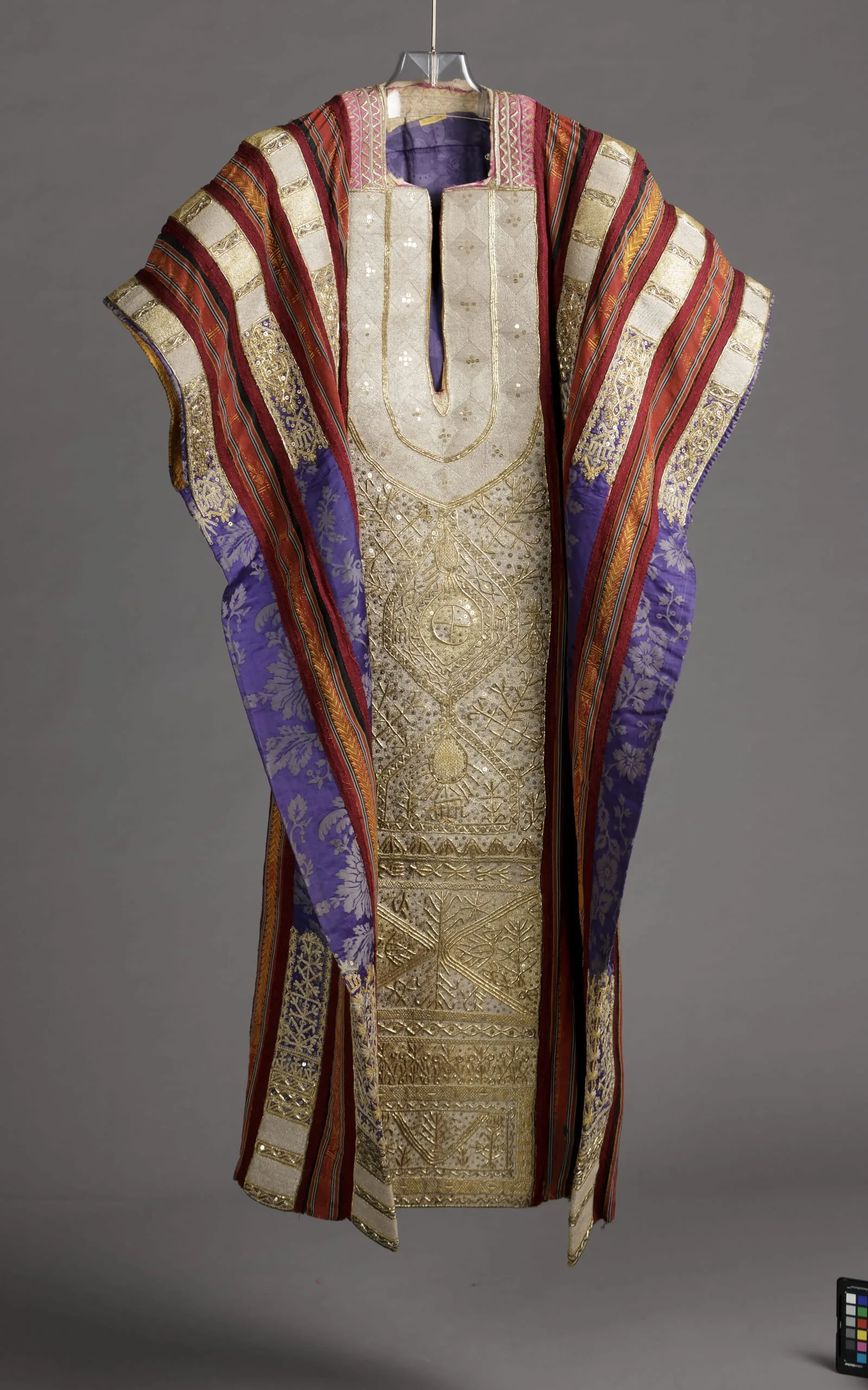 - Silk damask and silk plain weave with supplementary warp patterning, with silk braid, silk and metallic-thread embroidery and metal sequins